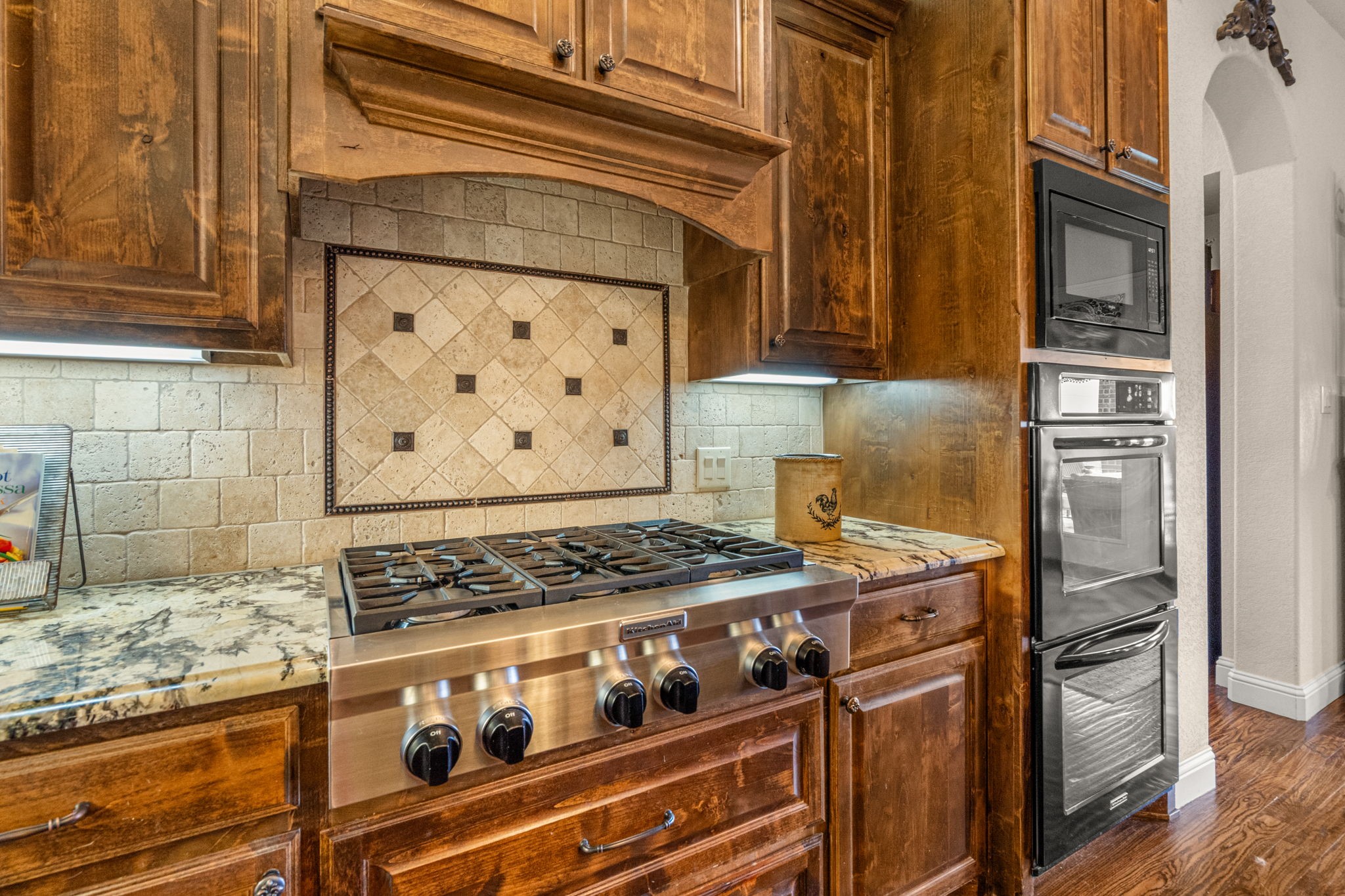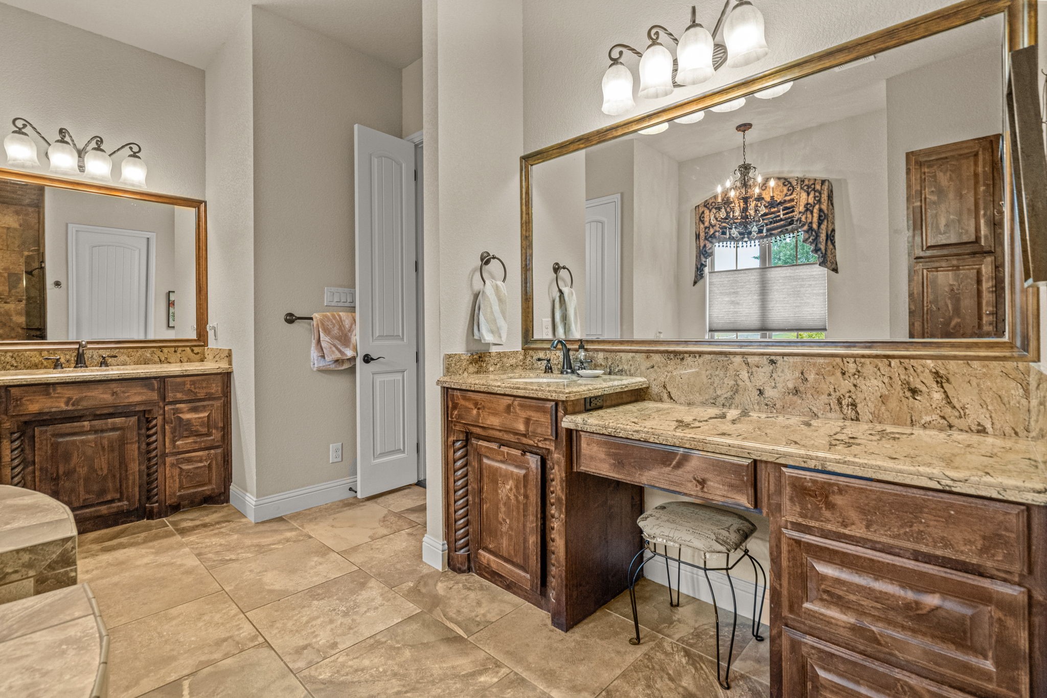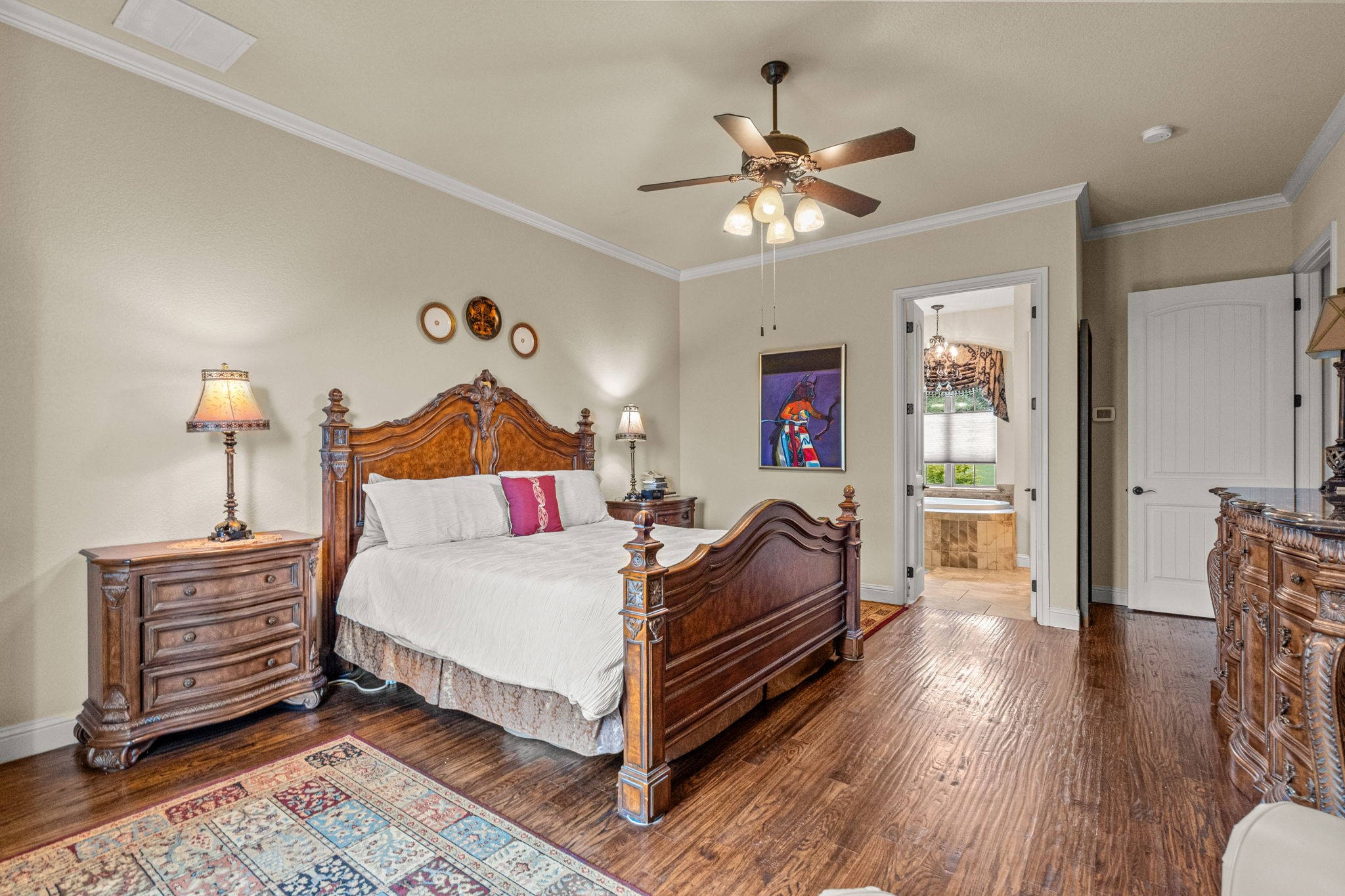 Perched atop a scenic hill in the gated community of Bella Flora - Bella Ranch, this exceptional property spans 2.87 acres and captures sweeping skyline views of Fort Worth. Thoughtfully designed for both everyday living and effortless entertaining, the home offers 3,722 square feet of beautifully appointed space, including 4 bedrooms and 4 full bathrooms. The main level features a serene primary suite, a private guest bedroom, a dedicated home office, and both formal and casual dining areas. The formal dining opens to the living room and includes a stylish wet bar. At the heart of the home, the kitchen impresses with a large center island with prep sink, double ovens, and generous storage. Upstairs, you'll find two spacious ensuite bedrooms and a second living area--ideal for a game room, media lounge, or teen retreat. Step outside to enjoy wide-open green space, a covered patio with a built-in grill, and a full sports court equipped for basketball, tennis and volleyball --complete with a rebounding net and lights for nighttime play. There's plenty of room to add a custom pool, and with ACC approval, the lot also allows for a guest house or workshop. Additional highlights include hand-scraped hardwood floors, a 4-car garage, and a side-entry porch with direct access to the kitchen--perfect for everyday convenience. Well: new pump in 2019, new control box in 2020. This is Texas living at its finest - luxury, land, and lifestyle, just minutes from Fort Worth's top-rated private schools, premier shopping, dining, and with convenient access to the property off 377. Foundation: Engineered post tension and pier.