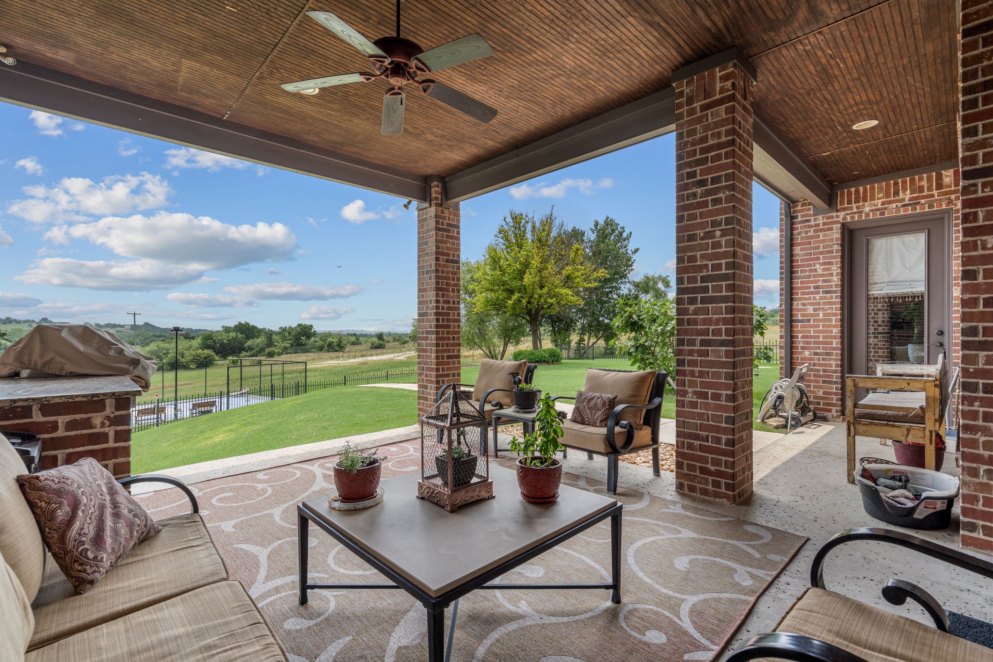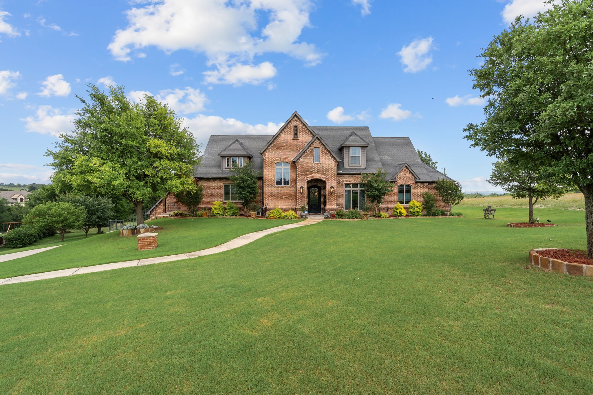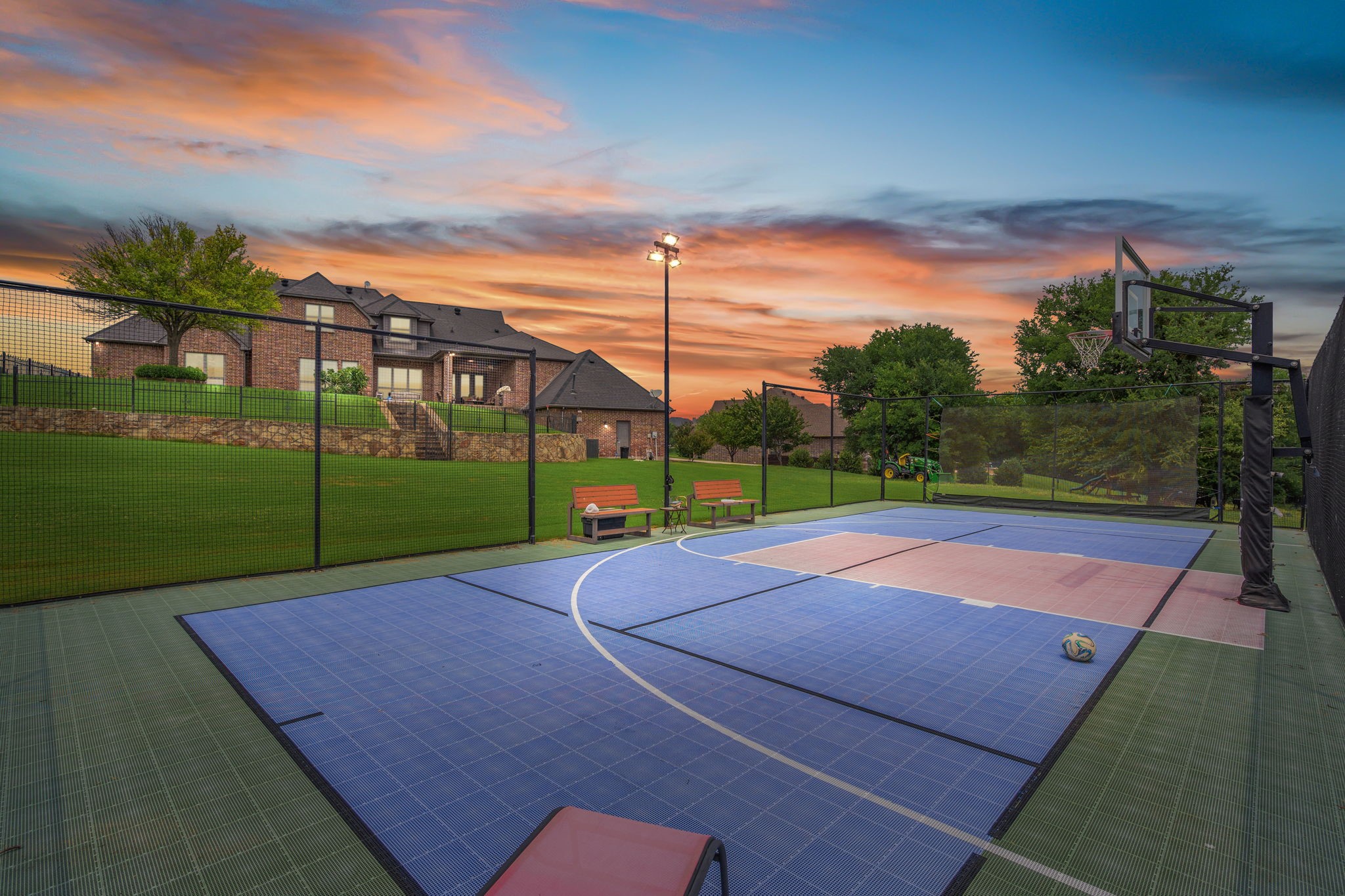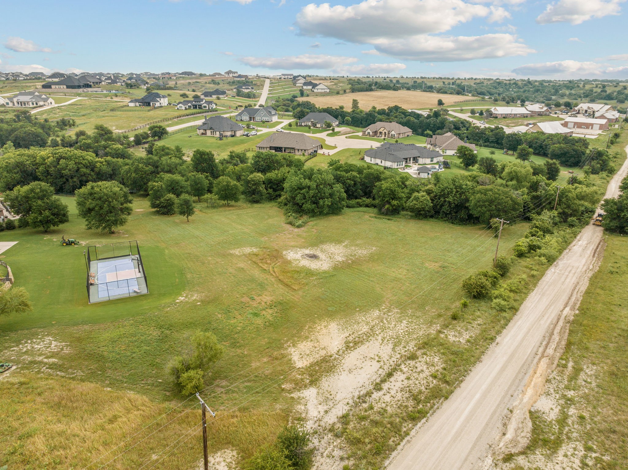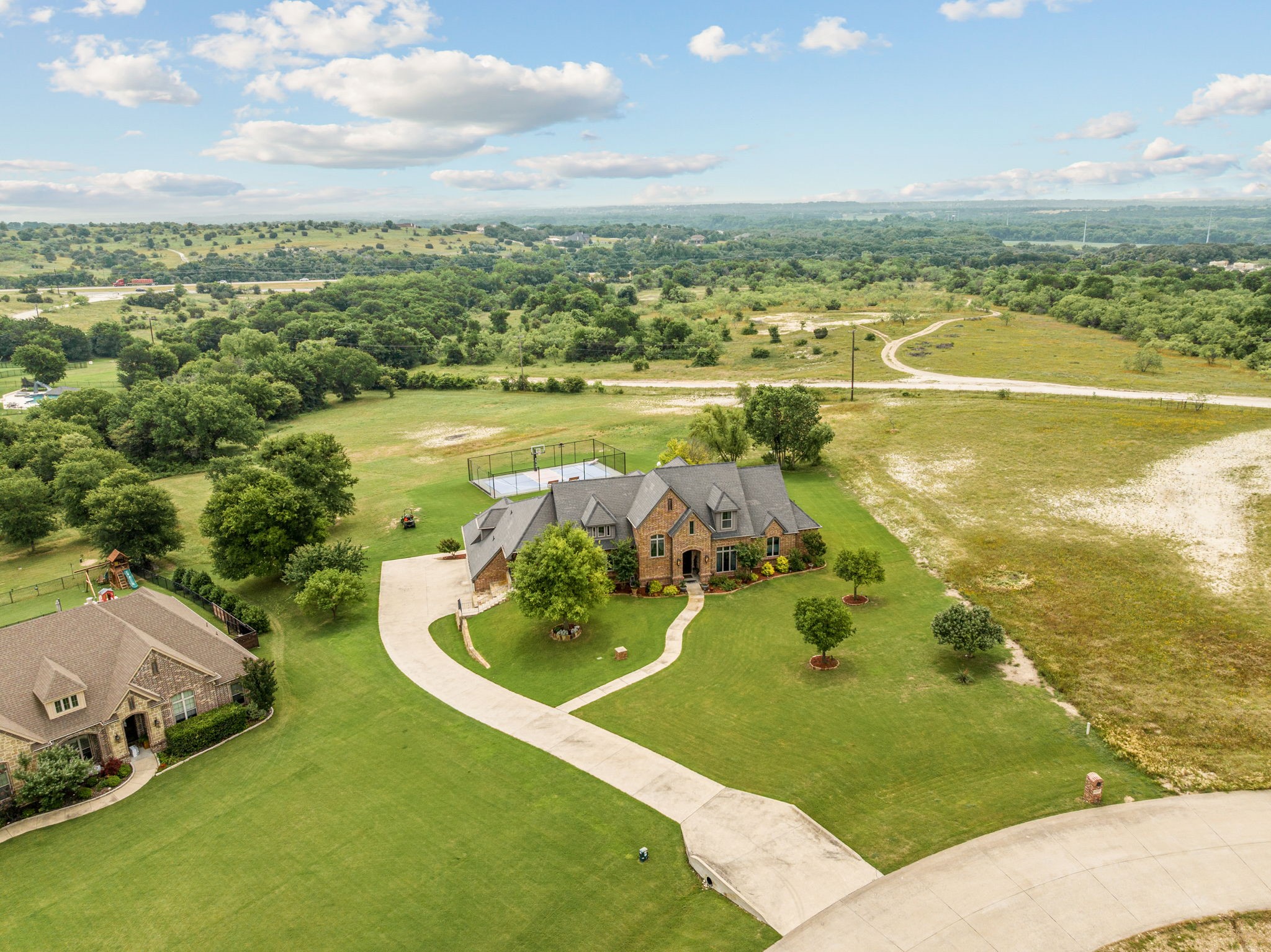 Perched atop a scenic hill in the gated community of Bella Flora - Bella Ranch, this exceptional property spans 2.87 acres and captures sweeping skyline views of Fort Worth. Thoughtfully designed for both everyday living and effortless entertaining, the home offers 3,722 square feet of beautifully appointed space, including 4 bedrooms and 4 full bathrooms. The main level features a serene primary suite, a private guest bedroom, a dedicated home office, and both formal and casual dining areas. The formal dining opens to the living room and includes a stylish wet bar. At the heart of the home, the kitchen impresses with a large center island with prep sink, double ovens, and generous storage. Upstairs, you'll find two spacious ensuite bedrooms and a second living area--ideal for a game room, media lounge, or teen retreat. Step outside to enjoy wide-open green space, a covered patio with a built-in grill, and a full sports court equipped for basketball, tennis and volleyball --complete with a rebounding net and lights for nighttime play. There's plenty of room to add a custom pool, and with ACC approval, the lot also allows for a guest house or workshop. Additional highlights include hand-scraped hardwood floors, a 4-car garage, and a side-entry porch with direct access to the kitchen--perfect for everyday convenience. Well: new pump in 2019, new control box in 2020. This is Texas living at its finest - luxury, land, and lifestyle, just minutes from Fort Worth's top-rated private schools, premier shopping, dining, and with convenient access to the property off 377. Foundation: Engineered post tension and pier.