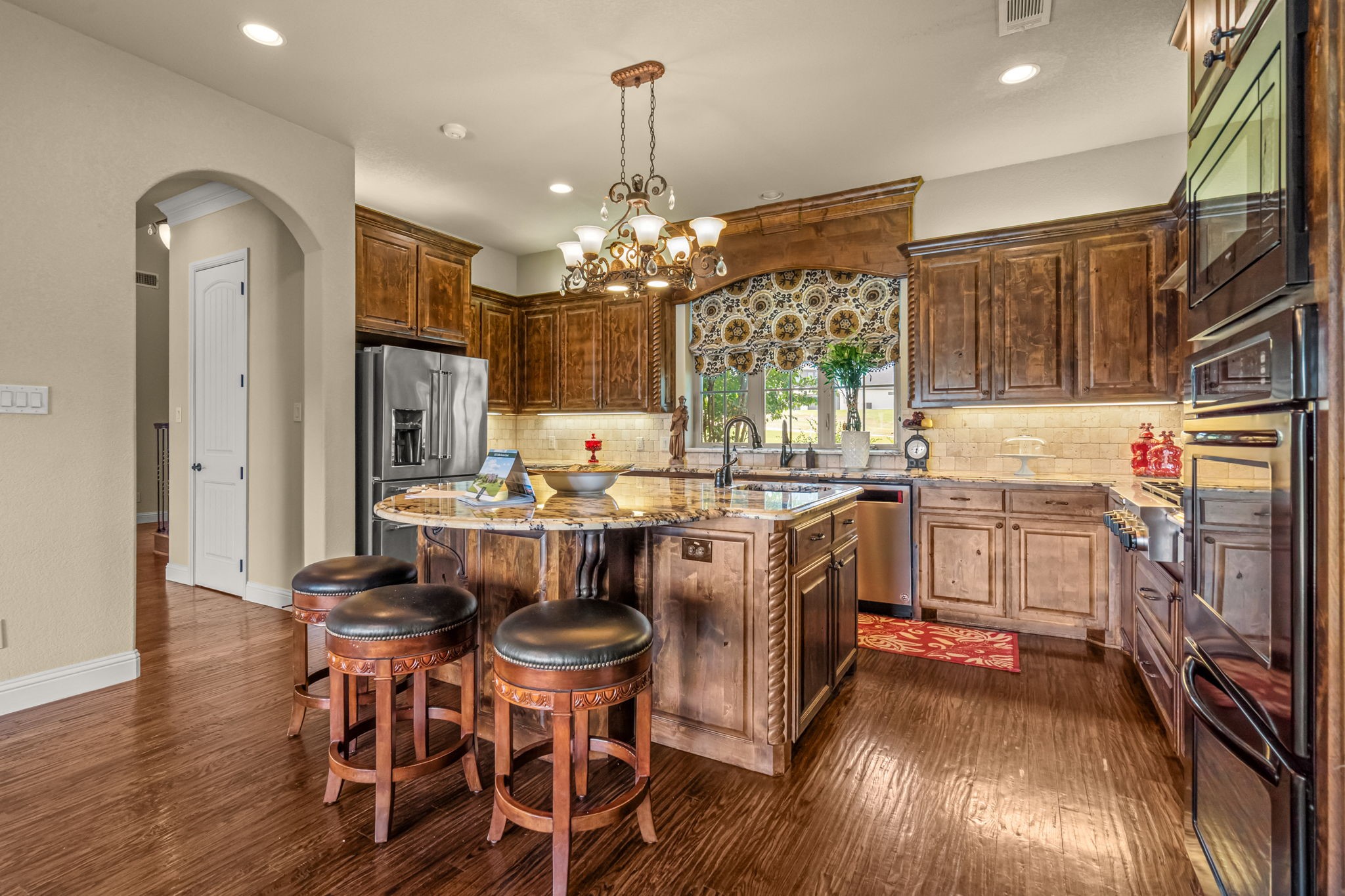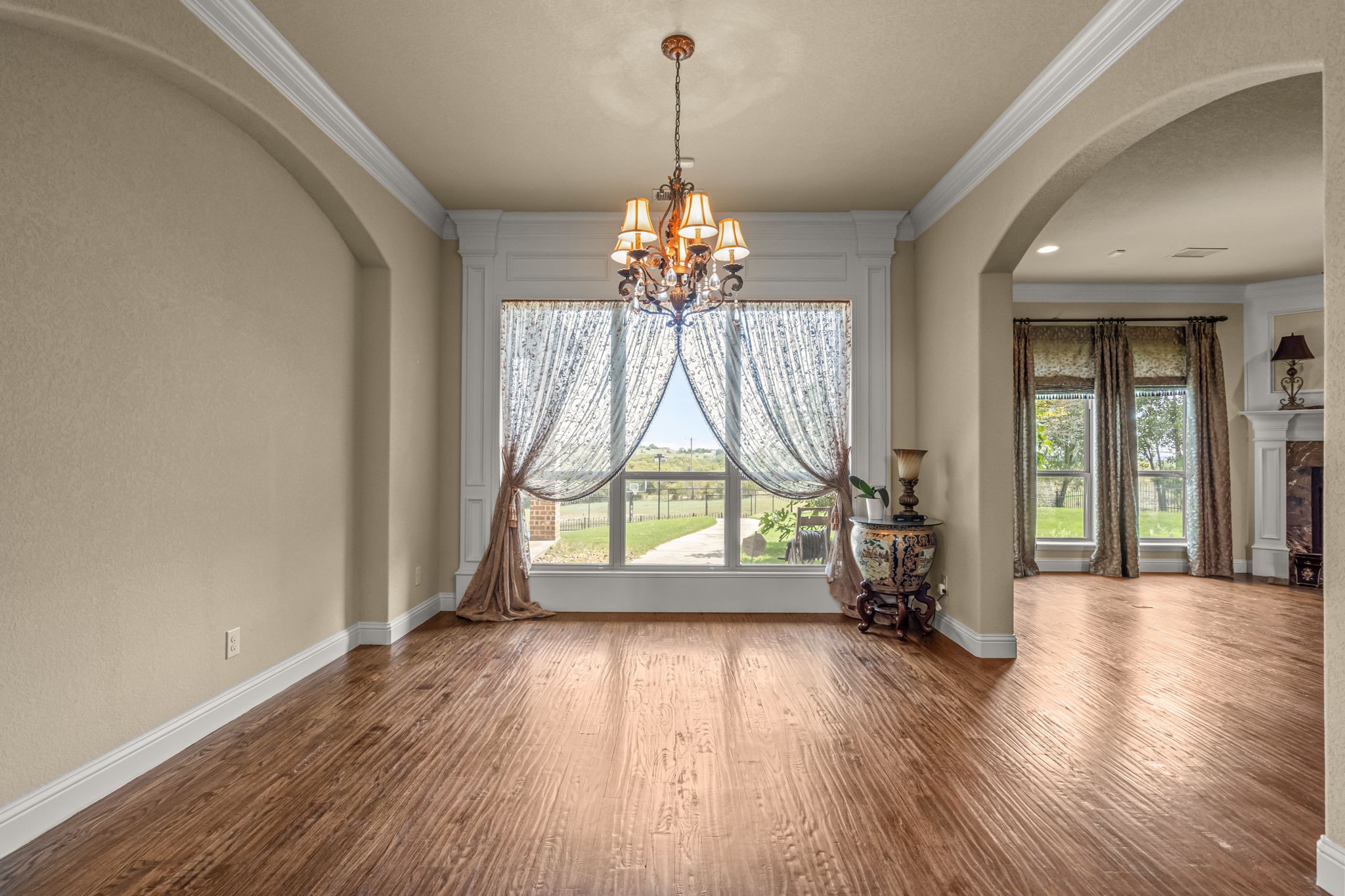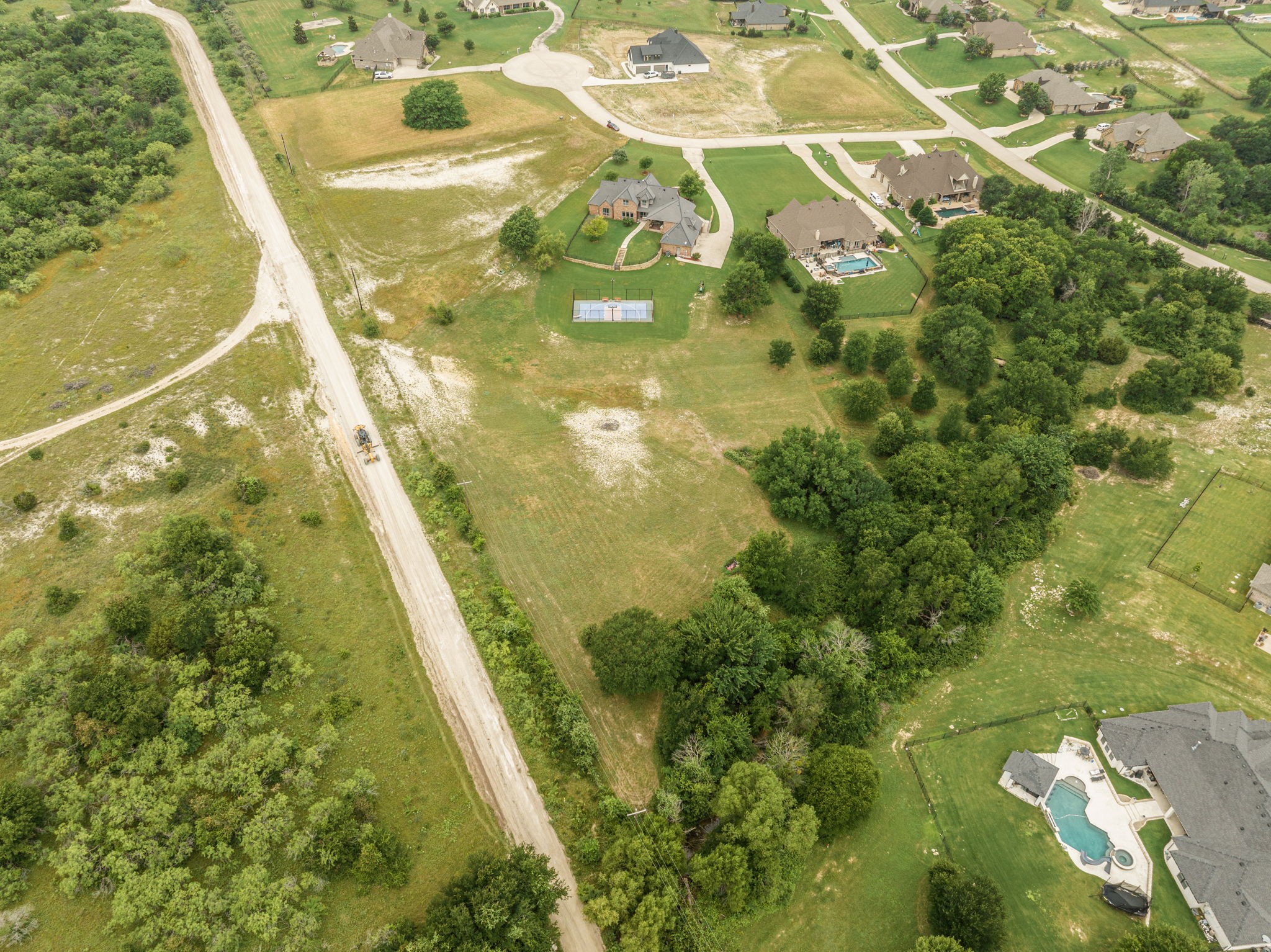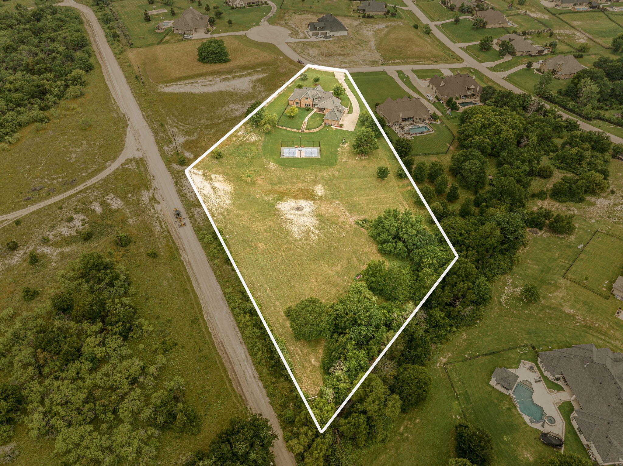Perched atop a scenic hill in the gated community of Bella Flora - Bella Ranch, this exceptional property spans 2.87 acres and captures sweeping skyline views of Fort Worth. Thoughtfully designed for both everyday living and effortless entertaining, the home offers 3,722 square feet of beautifully appointed space, including 4 bedrooms and 4 full bathrooms. The main level features a serene primary suite, a private guest bedroom, a dedicated home office, and both formal and casual dining areas. The formal dining opens to the living room and includes a stylish wet bar. At the heart of the home, the kitchen impresses with a large center island with prep sink, double ovens, and generous storage. Upstairs, you'll find two spacious ensuite bedrooms and a second living area--ideal for a game room, media lounge, or teen retreat. Step outside to enjoy wide-open green space, a covered patio with a built-in grill, and a full sports court equipped for basketball, tennis and volleyball --complete with a rebounding net and lights for nighttime play. There's plenty of room to add a custom pool, and with ACC approval, the lot also allows for a guest house or workshop. Additional highlights include hand-scraped hardwood floors, a 4-car garage, and a side-entry porch with direct access to the kitchen--perfect for everyday convenience. Well: new pump in 2019, new control box in 2020. This is Texas living at its finest - luxury, land, and lifestyle, just minutes from Fort Worth's top-rated private schools, premier shopping, dining, and with convenient access to the property off 377. Foundation: Engineered post tension and pier.