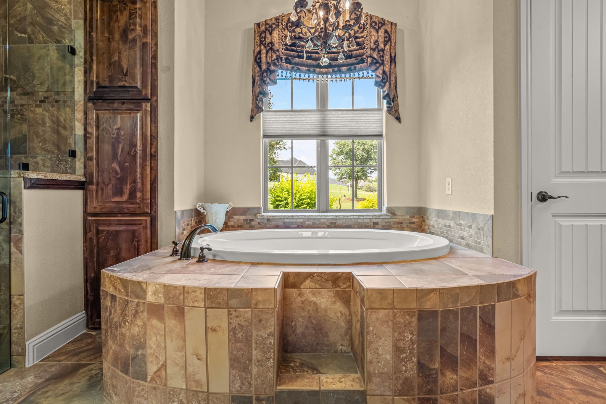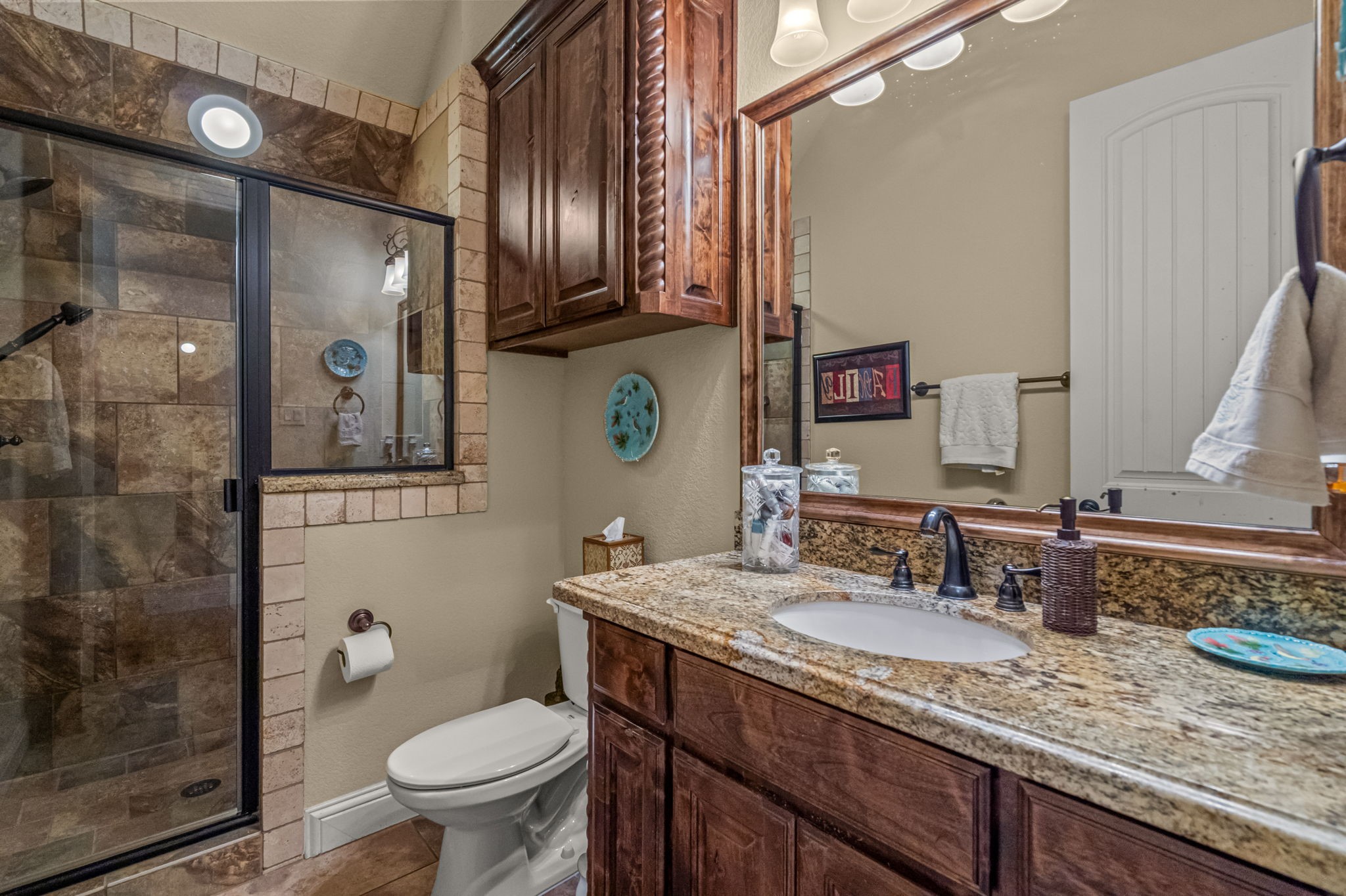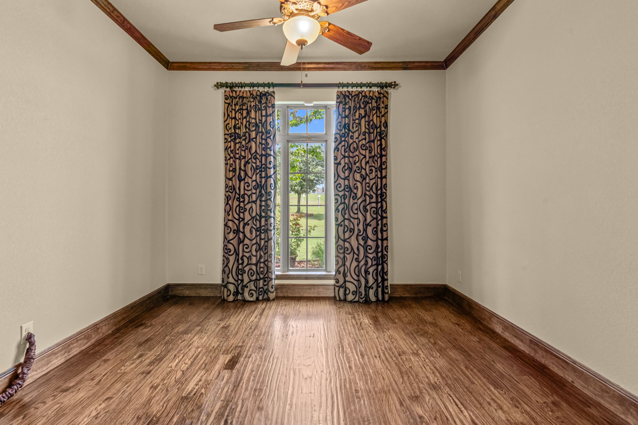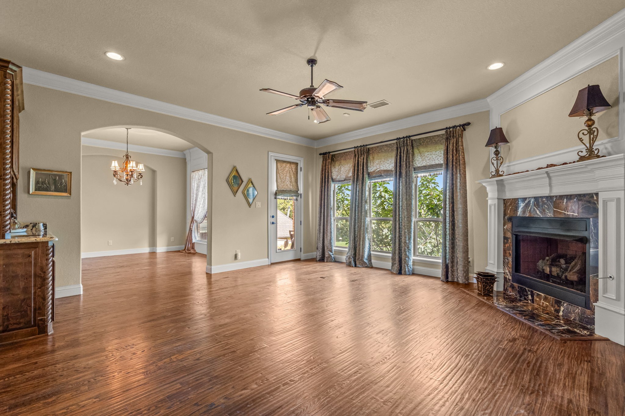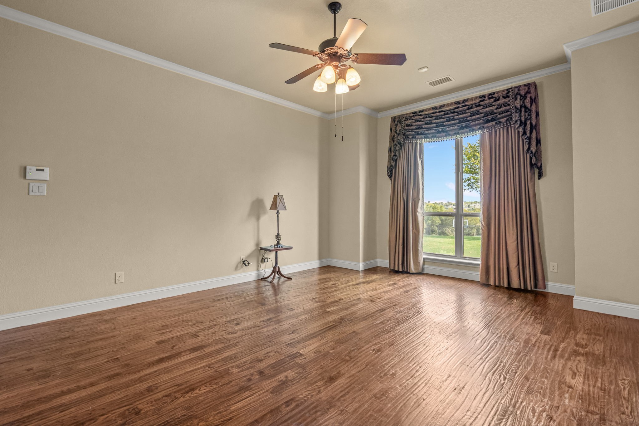 Perched atop a scenic hill in the gated community of Bella Flora - Bella Ranch, this exceptional property spans 2.87 acres and captures sweeping skyline views of Fort Worth. Thoughtfully designed for both everyday living and effortless entertaining, the home offers 3,722 square feet of beautifully appointed space, including 4 bedrooms and 4 full bathrooms. The main level features a serene primary suite, a private guest bedroom, a dedicated home office, and both formal and casual dining areas. The formal dining opens to the living room and includes a stylish wet bar. At the heart of the home, the kitchen impresses with a large center island with prep sink, double ovens, and generous storage. Upstairs, you'll find two spacious ensuite bedrooms and a second living area--ideal for a game room, media lounge, or teen retreat. Step outside to enjoy wide-open green space, a covered patio with a built-in grill, and a full sports court equipped for basketball, tennis and volleyball --complete with a rebounding net and lights for nighttime play. There's plenty of room to add a custom pool, and with ACC approval, the lot also allows for a guest house or workshop. Additional highlights include hand-scraped hardwood floors, a 4-car garage, and a side-entry porch with direct access to the kitchen--perfect for everyday convenience. Well: new pump in 2019, new control box in 2020. This is Texas living at its finest - luxury, land, and lifestyle, just minutes from Fort Worth's top-rated private schools, premier shopping, dining, and with convenient access to the property off 377. Foundation: Engineered post tension and pier.