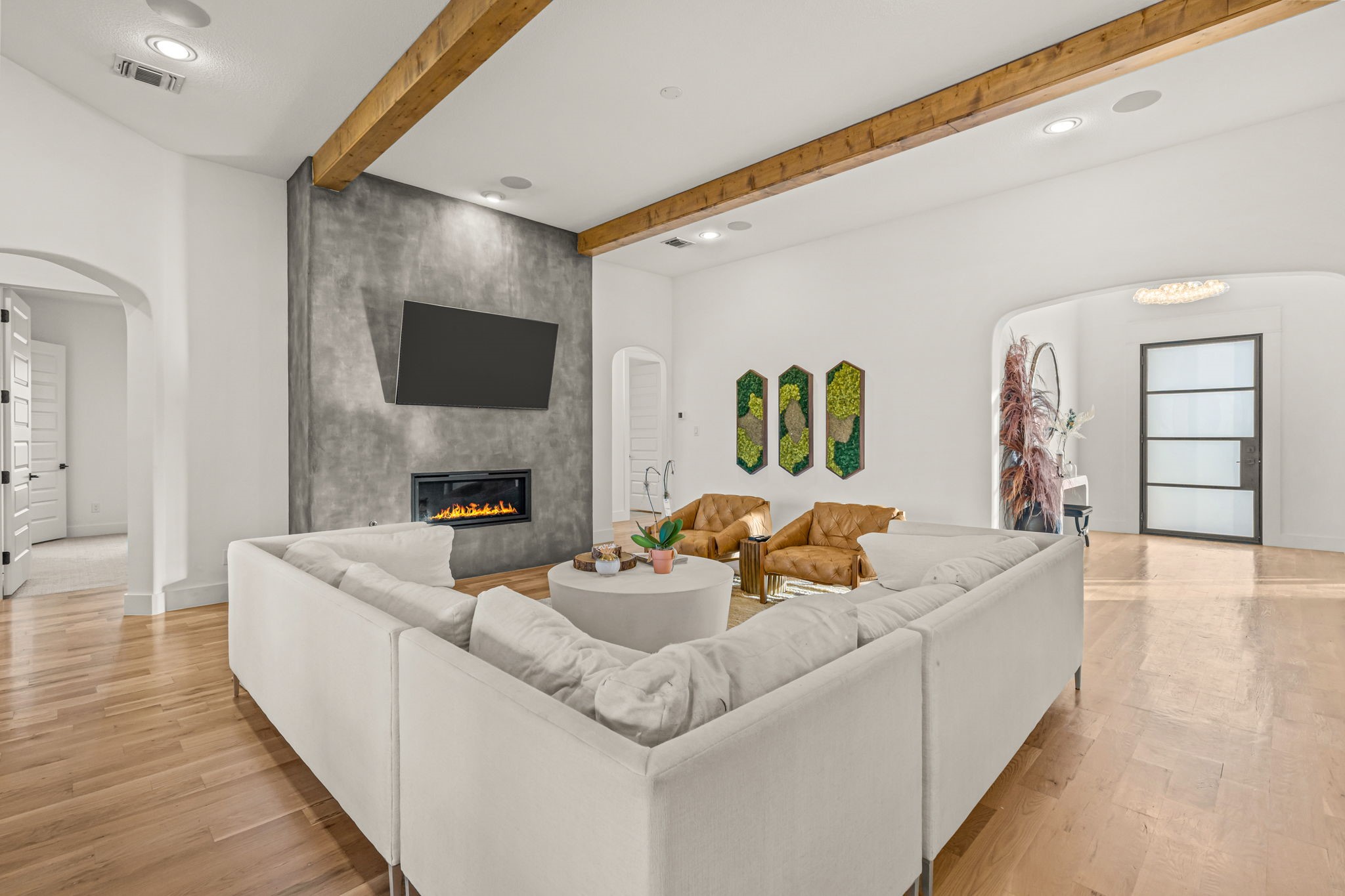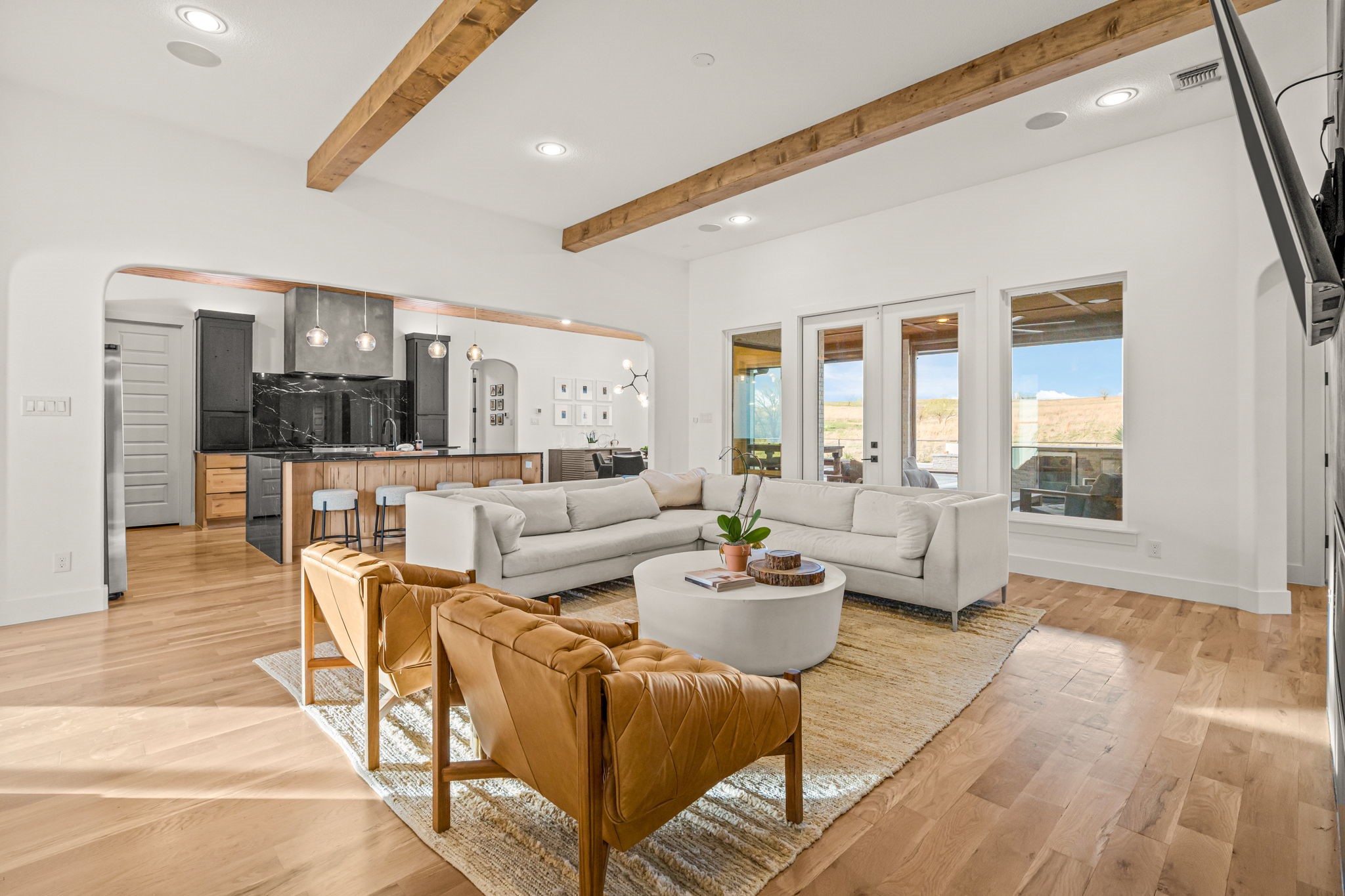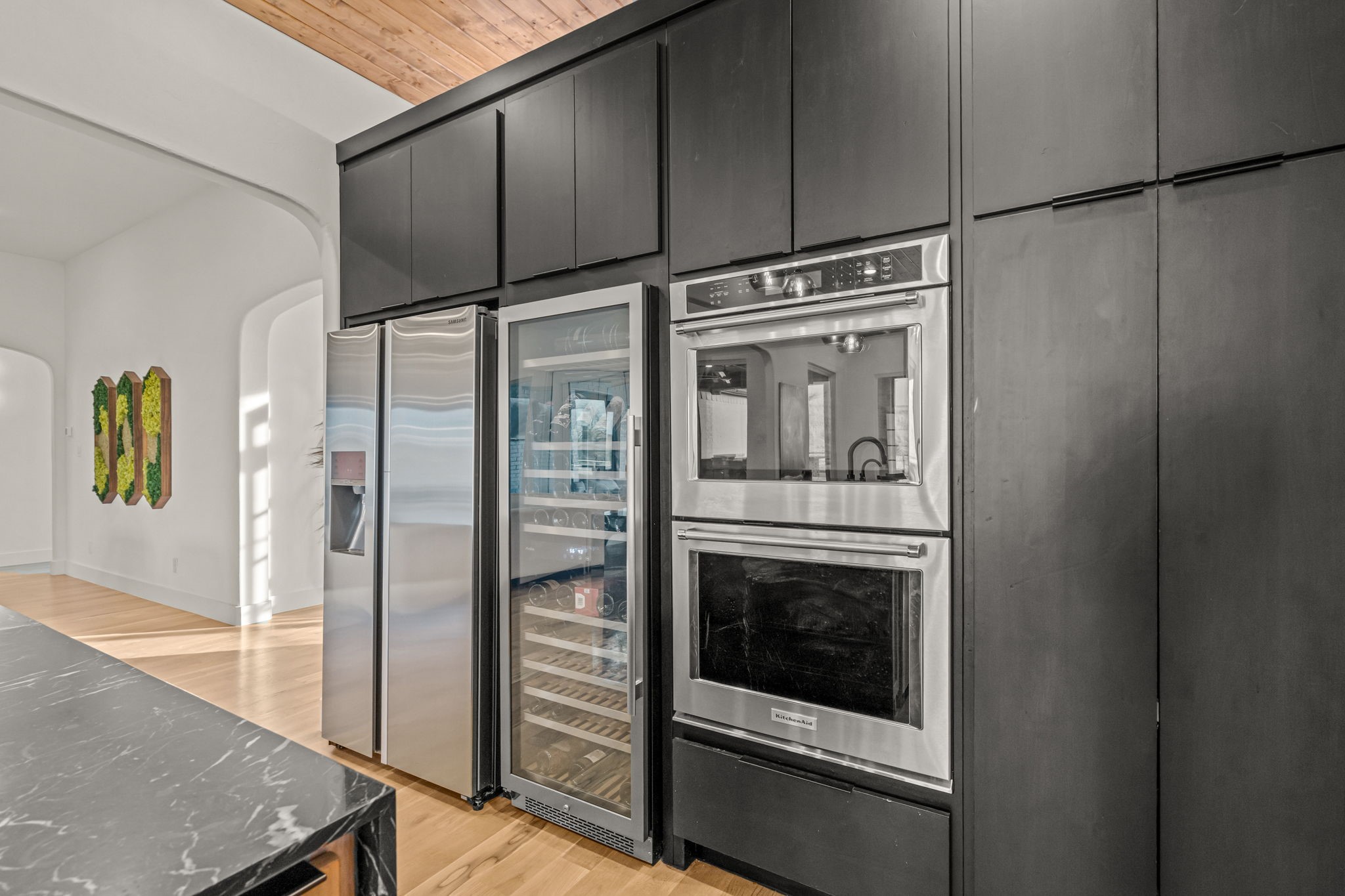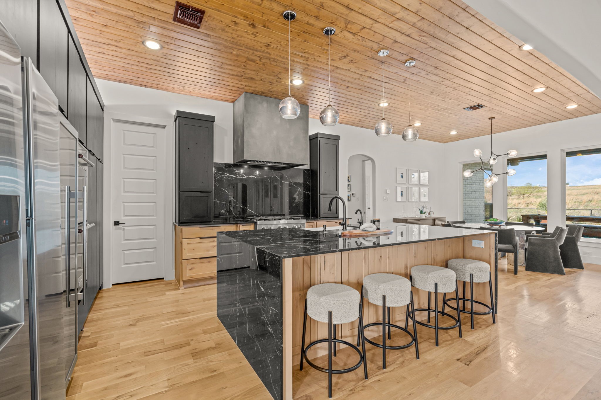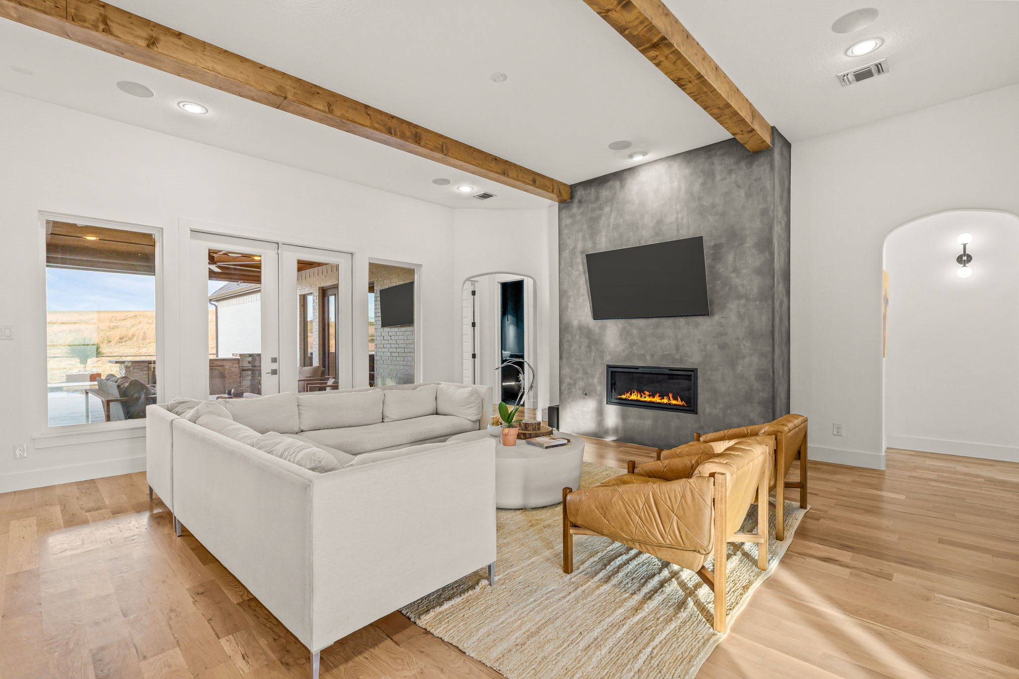 Inside, wide-plank hardwood flooring sets the tone, complemented by a striking moody study and a spacious living area anchored by a custom fireplace and exposed beam detailing. The open-concept layout flows seamlessly into a chef's kitchen equipped with double ovens, premium appliances, a 141-bottle wine refrigerator, marble surfaces, custom cabinetry, walk-in pantry, and tongue-and-groove wood ceiling accents.