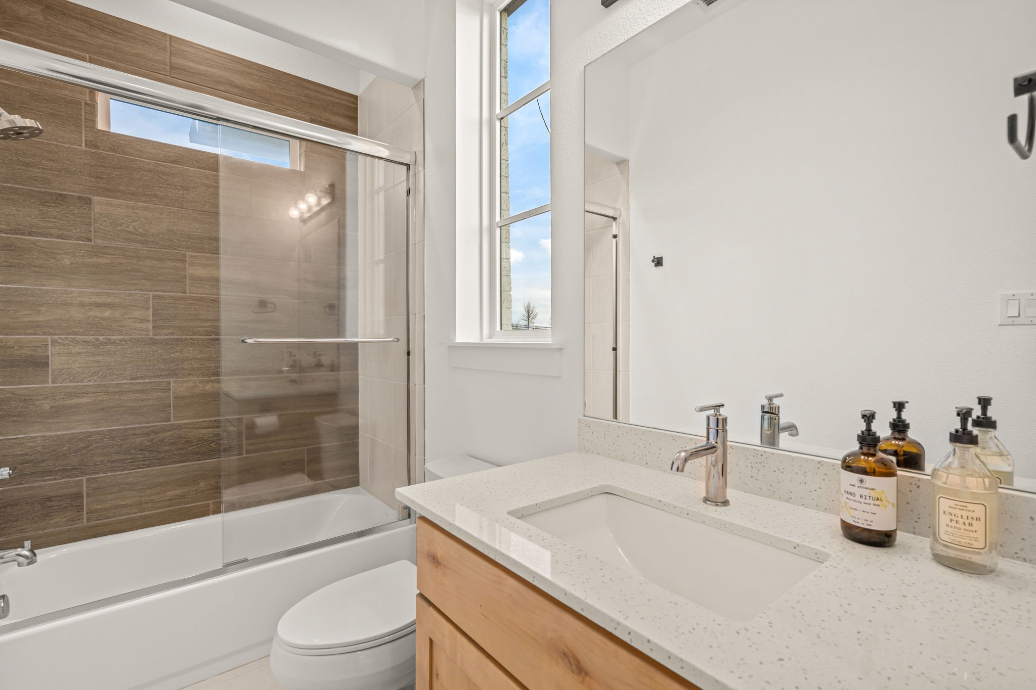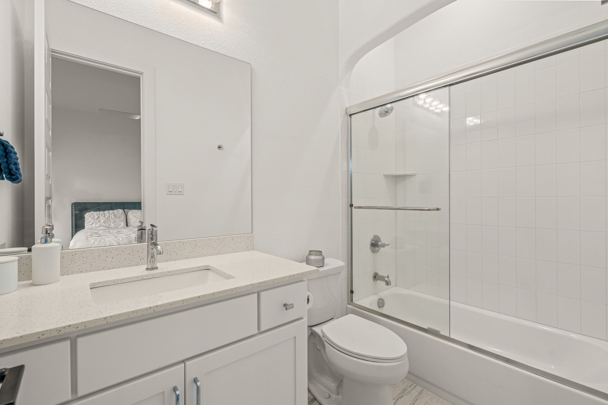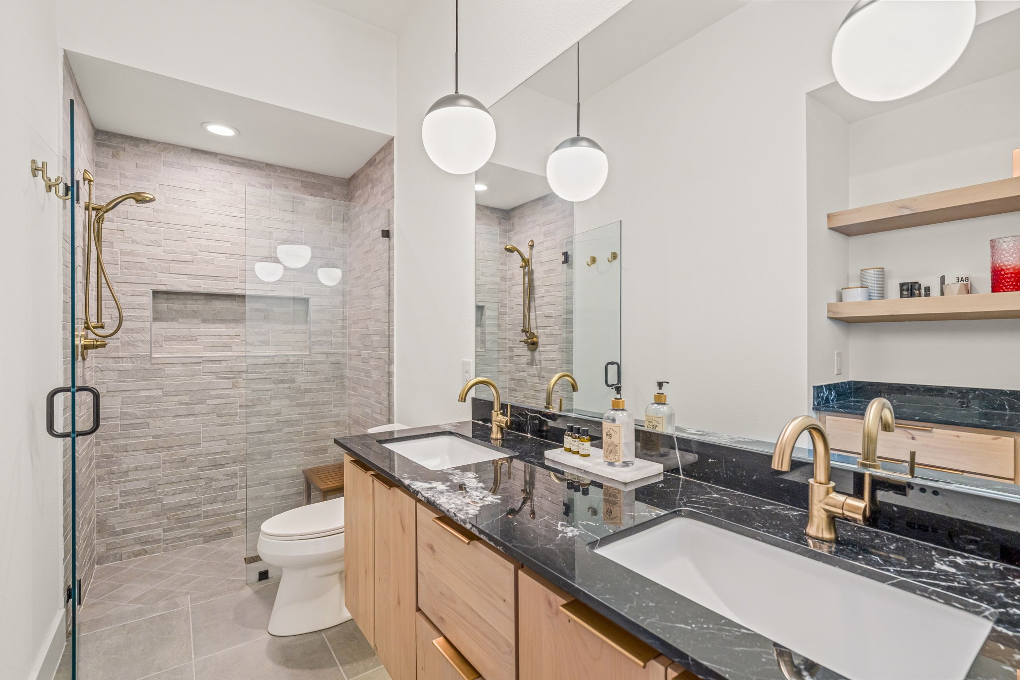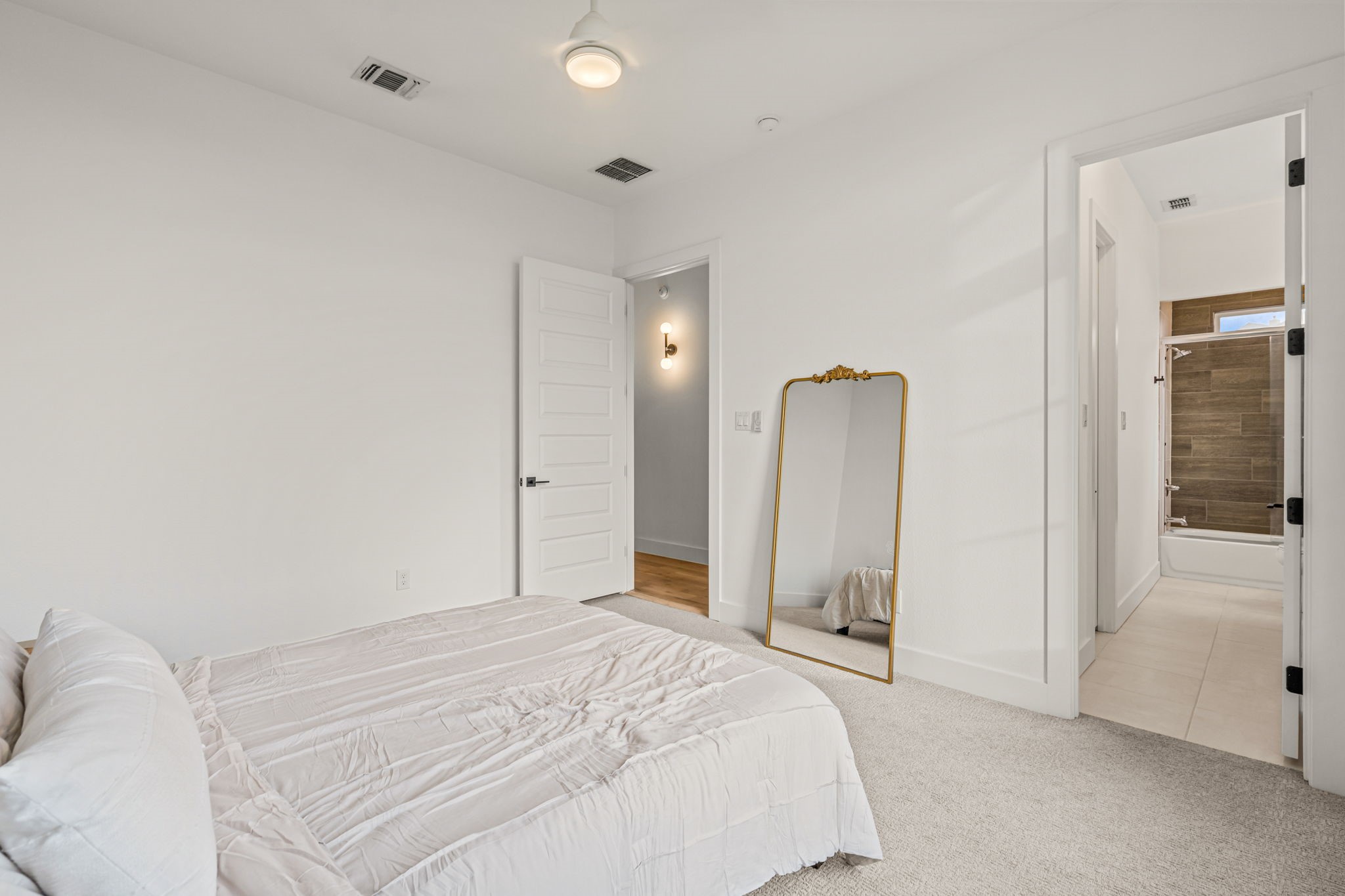 The primary suite offers a private retreat with dual vanities, dedicated makeup station, freestanding soaking tub, oversized walk-in shower, and expansive custom closet. All secondary bedrooms feature private en-suite baths, providing ideal accommodations for guests.