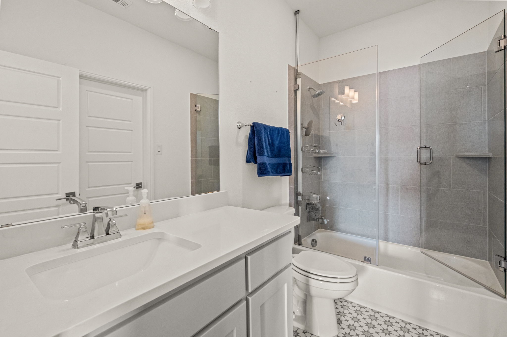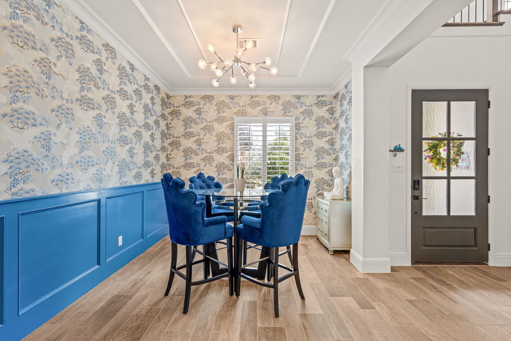 Stunning home in highly sought-after Walsh, featuring designer lighting, custom wallpaper, and a thoughtfully designed layout. Off the foyer, you'll find a formal dining room to the right and a private office to the left. The open-concept living area features glass sliding doors that seamlessly connect to the private outdoor living space, complete with a fireplace, heated pool and spa, outdoor shower, and mature magnolia trees that create a serene backyard retreat. The home backs to a peaceful greenbelt, providing added privacy. Perfect for entertaining, the eat-in kitchen offers a large center island and high-end appliances and opens to the spacious living room with built-ins and a fireplace. The first-floor owner's retreat features a spa-like bath and dual walk-in closets, while a guest suite with its own private bath is also located on the main level. Upstairs includes a game room with wet bar, media room, additional sitting area, and two bedrooms with two full bathrooms. Additional features include UV lights in the HVAC system, a whole-home air scrubber, and two humidifiers. Recent updates include a glass fence along the back patio, a new Bosch dishwasher, and floor-to-ceiling bookshelves in the upstairs bedroom and sitting area. Enjoy easy access to Walsh amenities including a fitness center, resort-style pool, sports courts, multiple playgrounds, miles of walking trails, a private lake, dog park, neighborhood market, and fuel station.