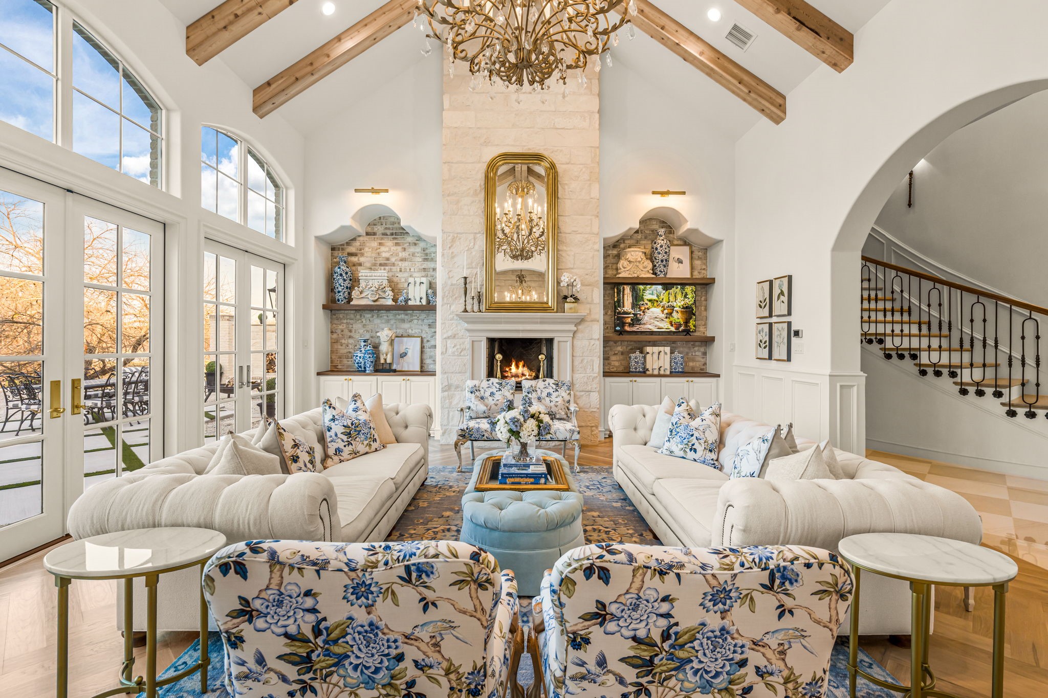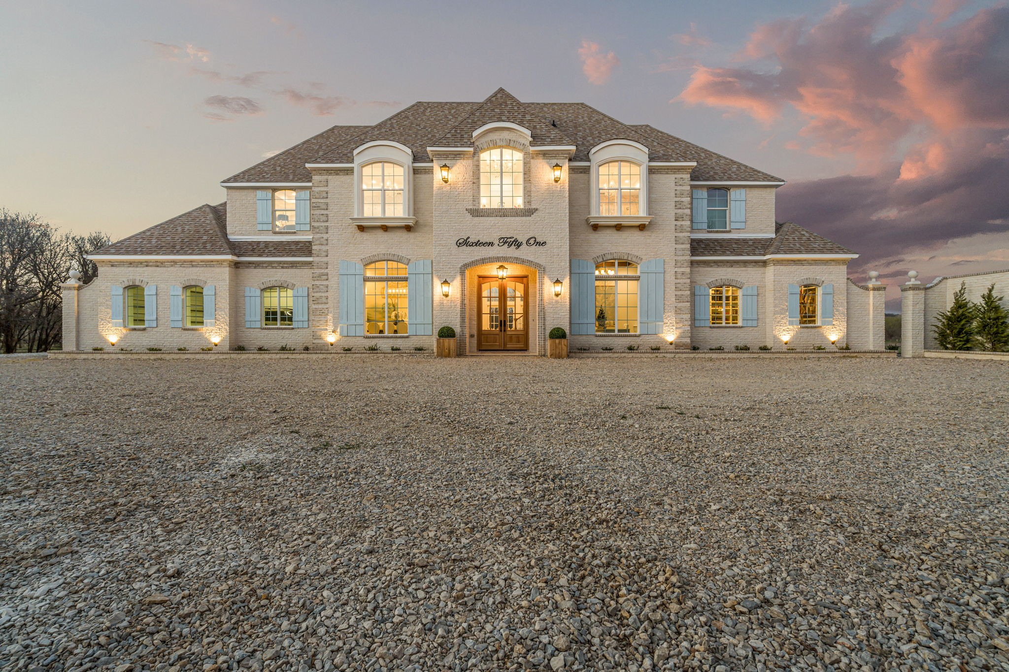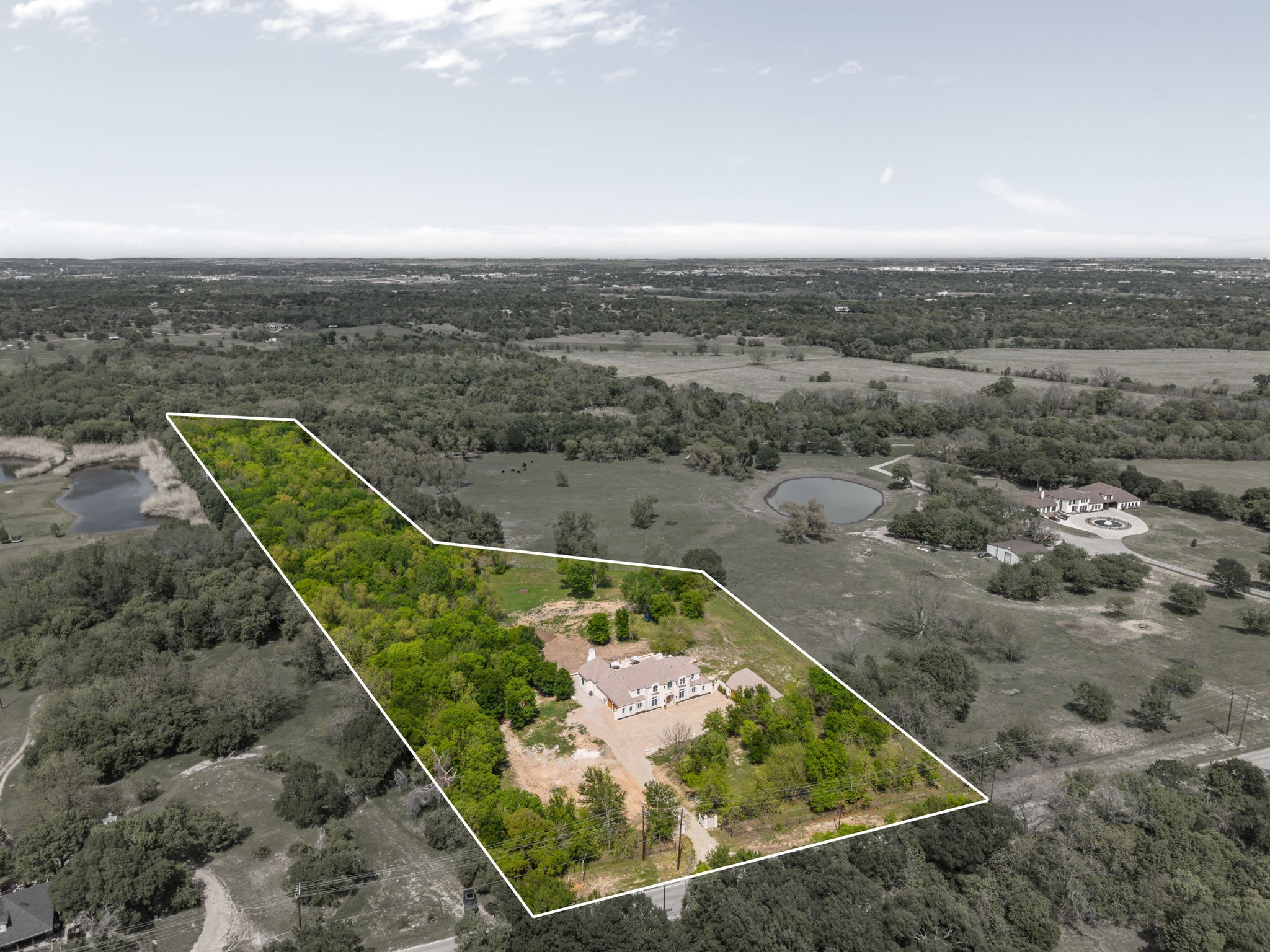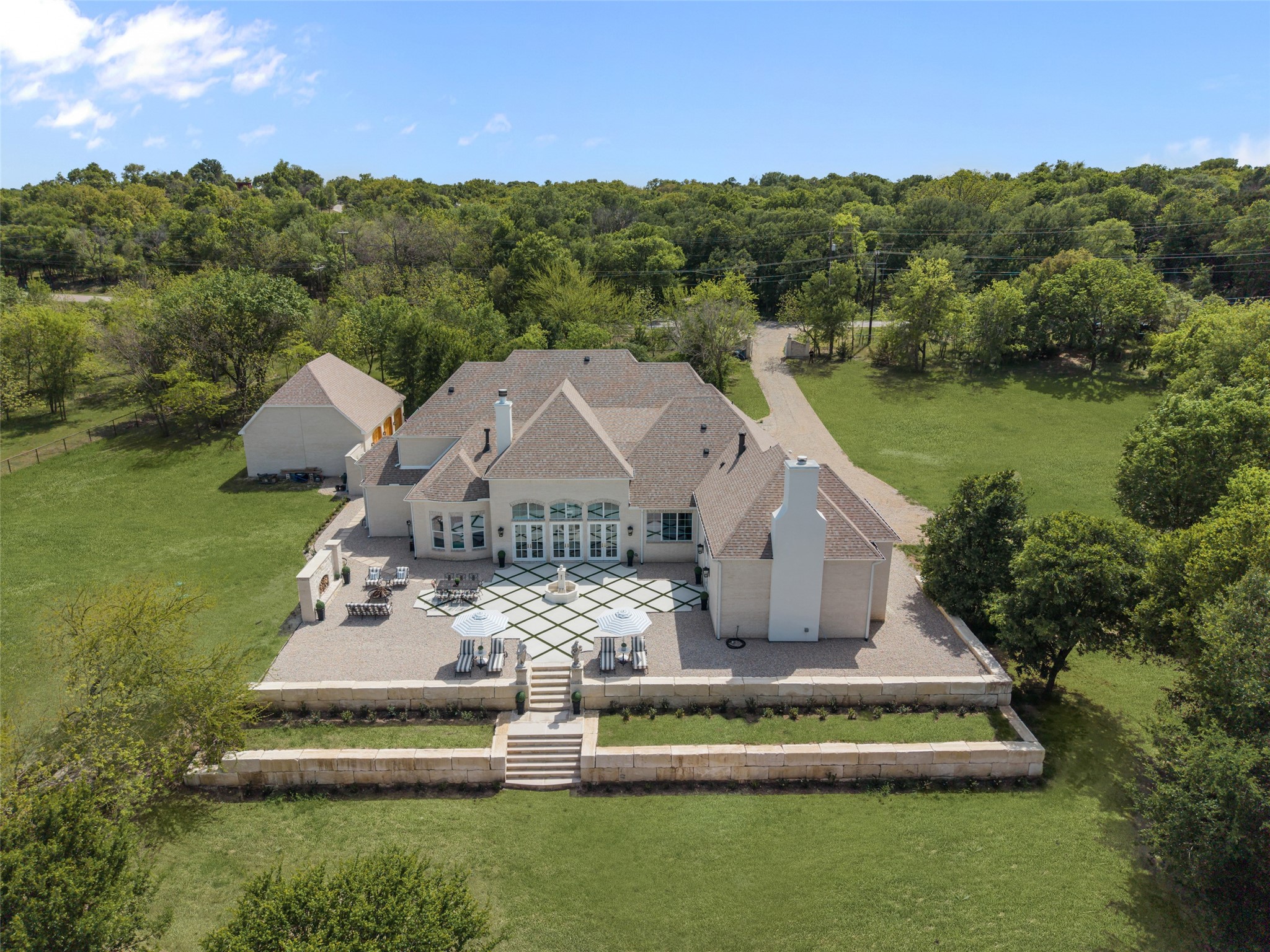 Tucked behind beautiful private gates and a canopy of towering trees on 10 pristine acres in Aledo, this extraordinary French Country estate offers a rare blend of privacy, craftsmanship, and thoughtful design just five minutes from Press Cafe and I-20. A grand entry foyer welcomes you with light checkered tile flooring, soaring ceilings, flanked by a formal dining room and designated study. Beyond the foyer, the home opens into the heart of the living spaces where dramatic cathedral ceilings in the living room and kitchen create an incredible sense of scale and light. The chef's kitchen, accented with warm brick and stone, features a massive island, butler's pantry, and herringbone wood floors that continue into the living area. Picturesque windows throughout fill the home with natural light and frame views of the surrounding acreage. The living room is anchored by a grand floor-to-ceiling stone fireplace, flanked by built-ins with brick accents. One of the home's most unforgettable spaces is the grand bibliotheque an extraordinary library featuring dual fireplaces, custom built-ins, a full bar with ice machine and refrigerator, creating the perfect setting for entertaining or quiet evenings. Entertainment continues with a first-floor theater room. The primary suite, features paneling, rich hardwood floors, a fireplace, while the spa-inspired bath showcases polished neutral checkered flooring, a walk-through brick shower, and a freestanding soaking tub. Separate his-and-her closets provide exceptional storage. A laundry within the primary closet adds everyday convenience. Built with exceptional efficiency, the home is fully encapsulated with spray foam insulation for year-round comfort. Additional highlights include a five-car garage, spacious guest suites, and a thoughtfully designed floor plan with no wasted space. A survey, pool renderings, and build plans are available upon request. Select furnishings are available to purchase upon request.