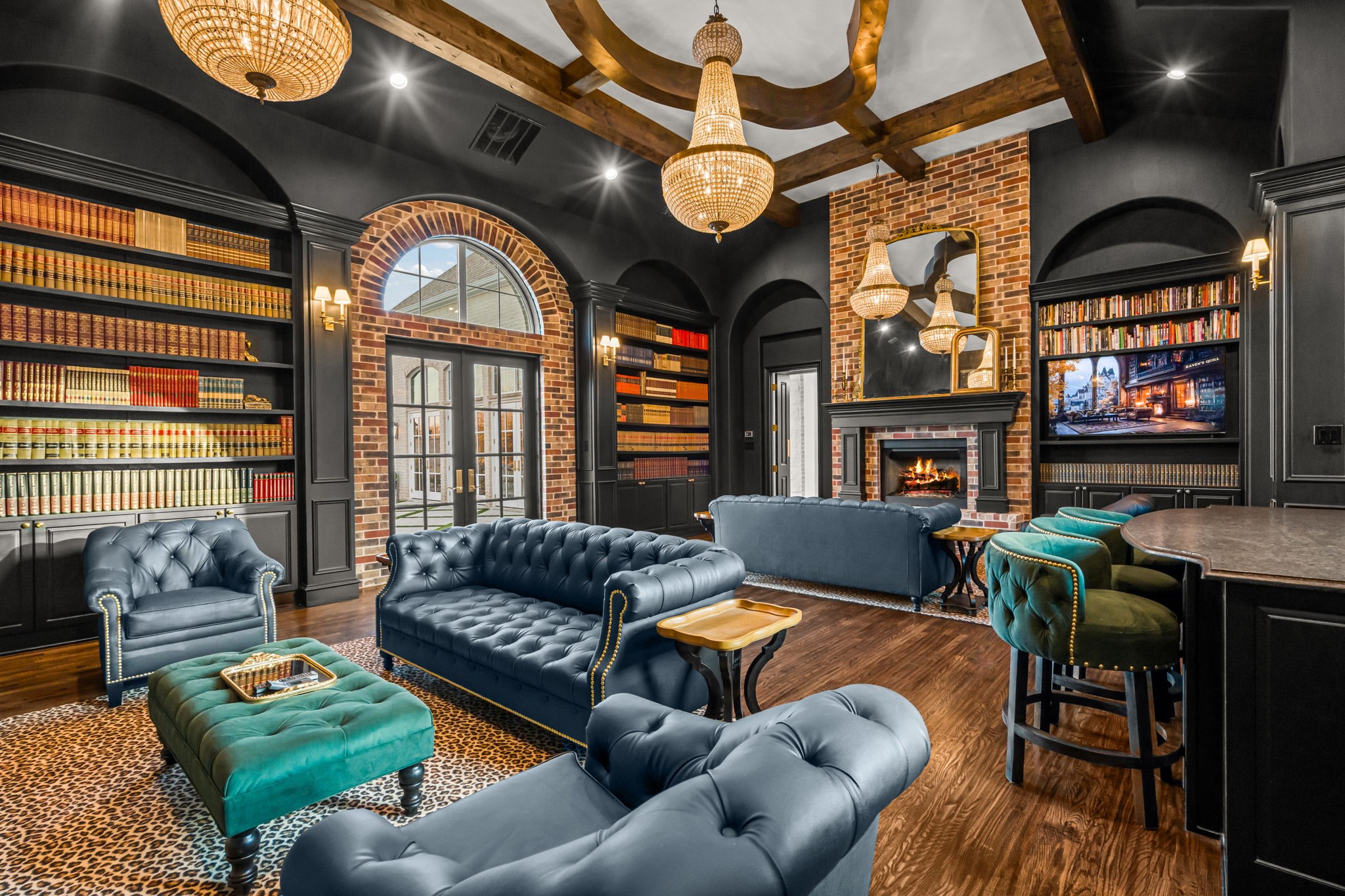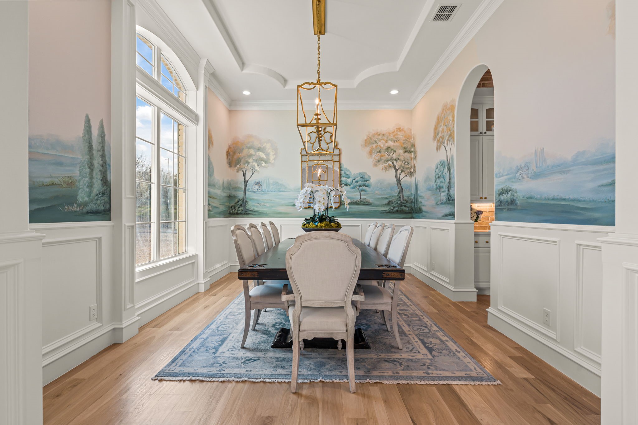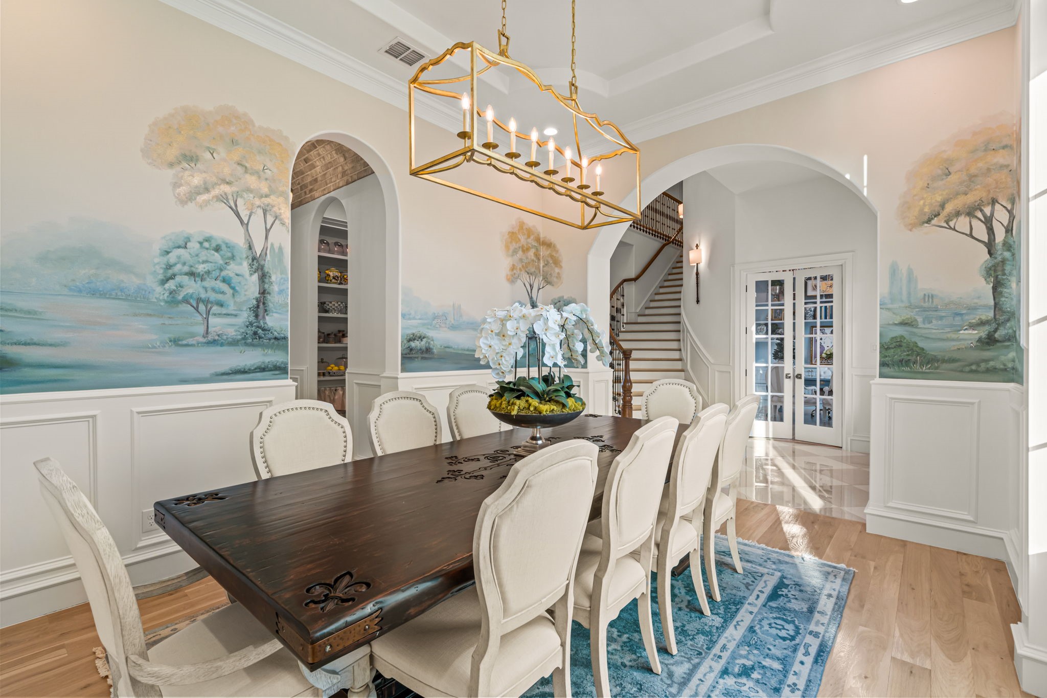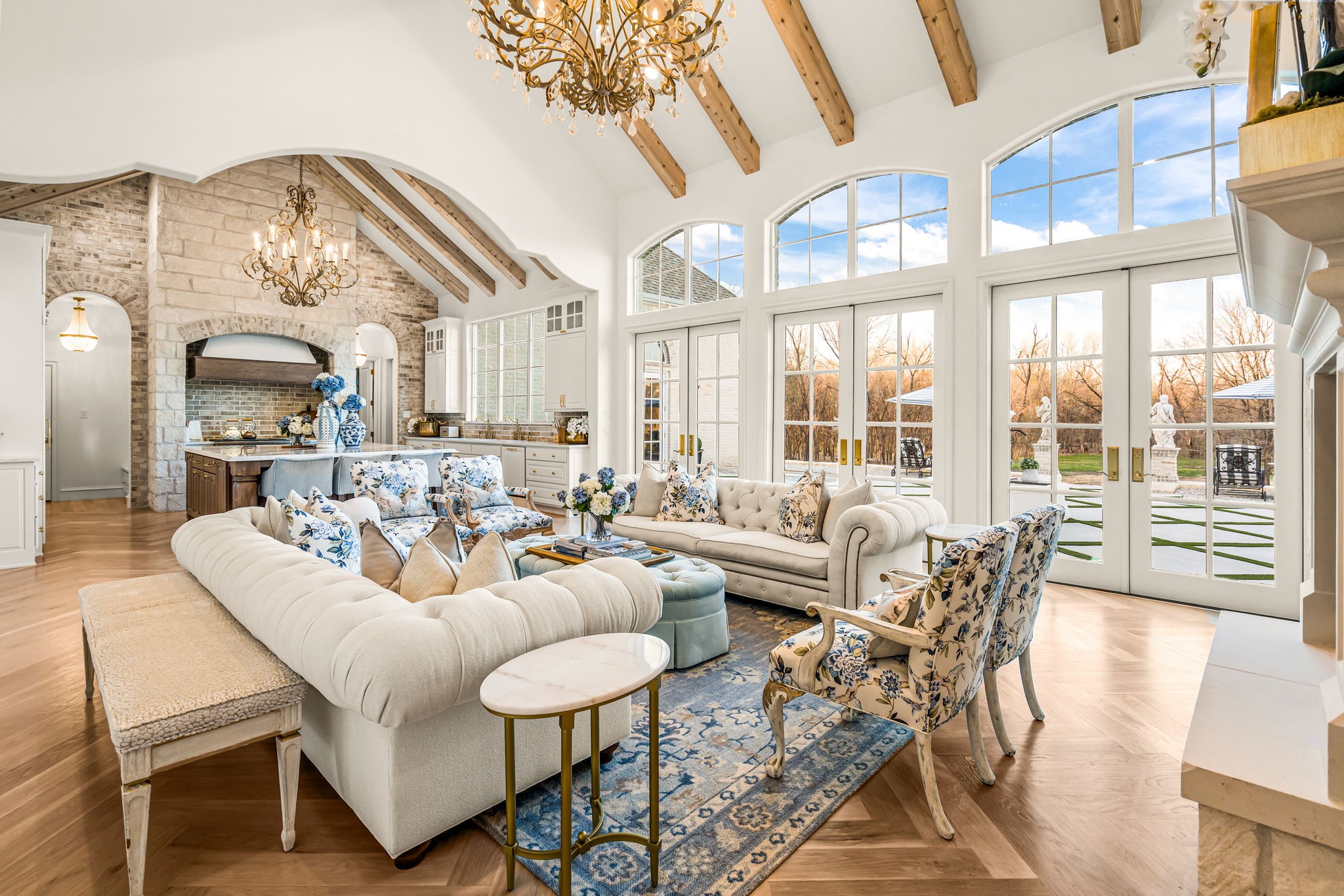 Tucked behind beautiful private gates and a canopy of towering trees on 10 pristine acres in Aledo, this extraordinary French Country estate offers a rare blend of privacy, craftsmanship, and thoughtful design just five minutes from Press Cafe and I-20. A grand entry foyer welcomes you with light checkered tile flooring, soaring ceilings, flanked by a formal dining room and designated study. Beyond the foyer, the home opens into the heart of the living spaces where dramatic cathedral ceilings in the living room and kitchen create an incredible sense of scale and light. The chef's kitchen, accented with warm brick and stone, features a massive island, butler's pantry, and herringbone wood floors that continue into the living area. Picturesque windows throughout fill the home with natural light and frame views of the surrounding acreage. The living room is anchored by a grand floor-to-ceiling stone fireplace, flanked by built-ins with brick accents. One of the home's most unforgettable spaces is the grand bibliotheque an extraordinary library featuring dual fireplaces, custom built-ins, a full bar with ice machine and refrigerator, creating the perfect setting for entertaining or quiet evenings. Entertainment continues with a first-floor theater room. The primary suite, features paneling, rich hardwood floors, a fireplace, while the spa-inspired bath showcases polished neutral checkered flooring, a walk-through brick shower, and a freestanding soaking tub. Separate his-and-her closets provide exceptional storage. A laundry within the primary closet adds everyday convenience. Built with exceptional efficiency, the home is fully encapsulated with spray foam insulation for year-round comfort. Additional highlights include a five-car garage, spacious guest suites, and a thoughtfully designed floor plan with no wasted space. A survey, pool renderings, and build plans are available upon request. Select furnishings are available to purchase upon request.