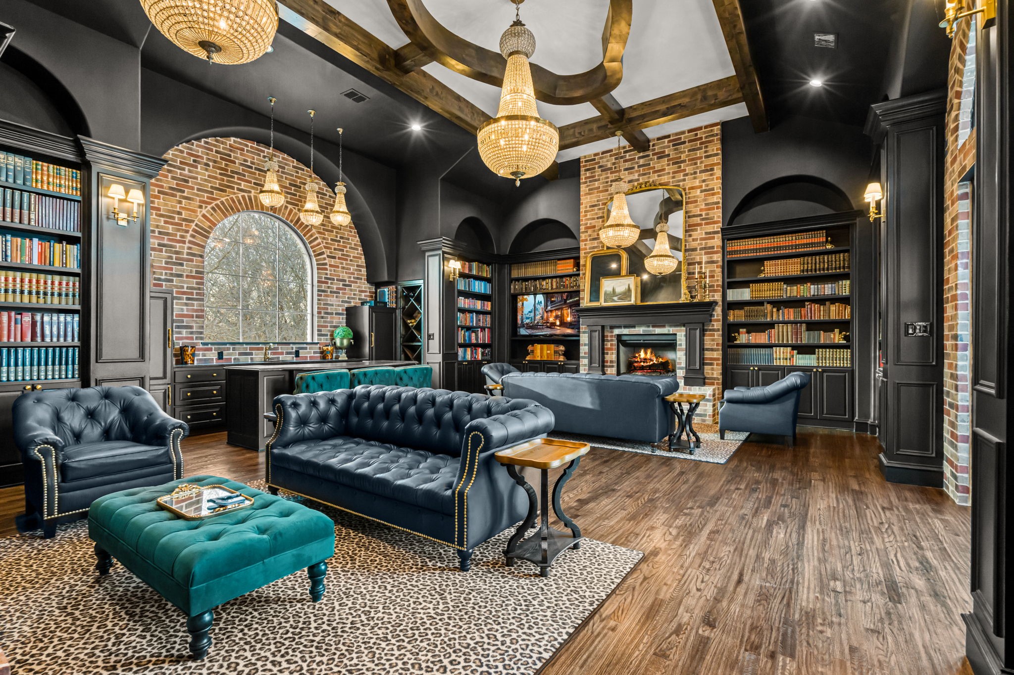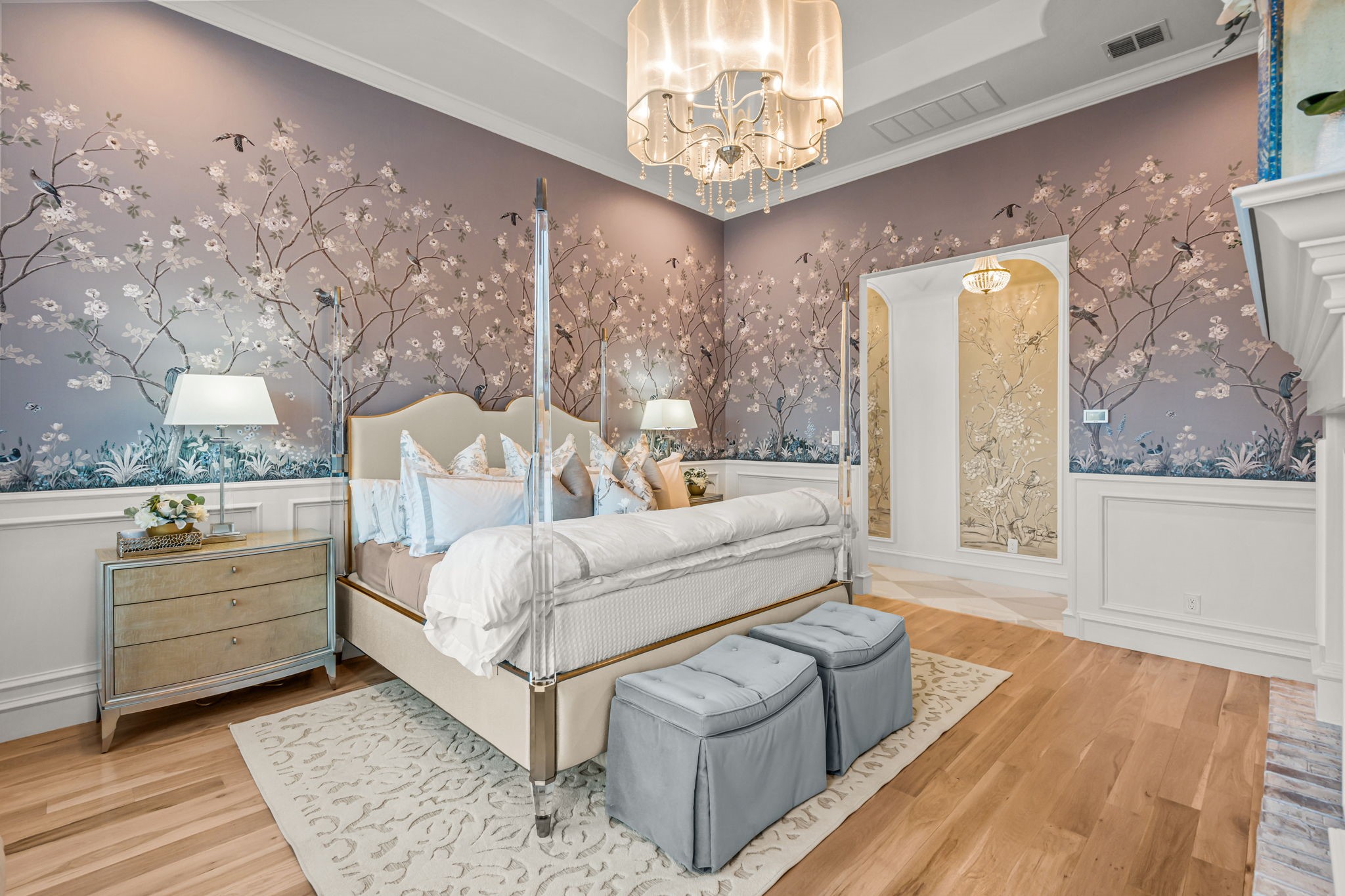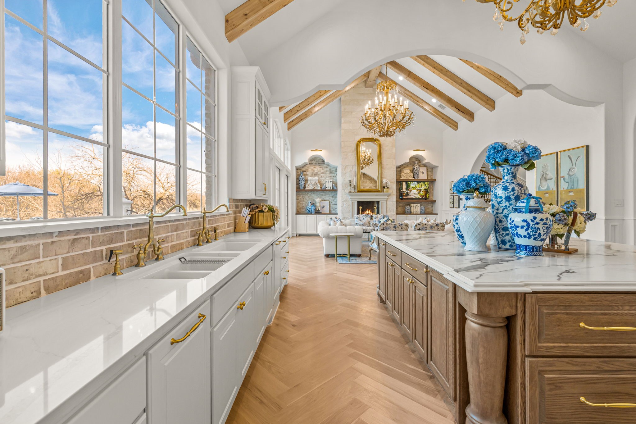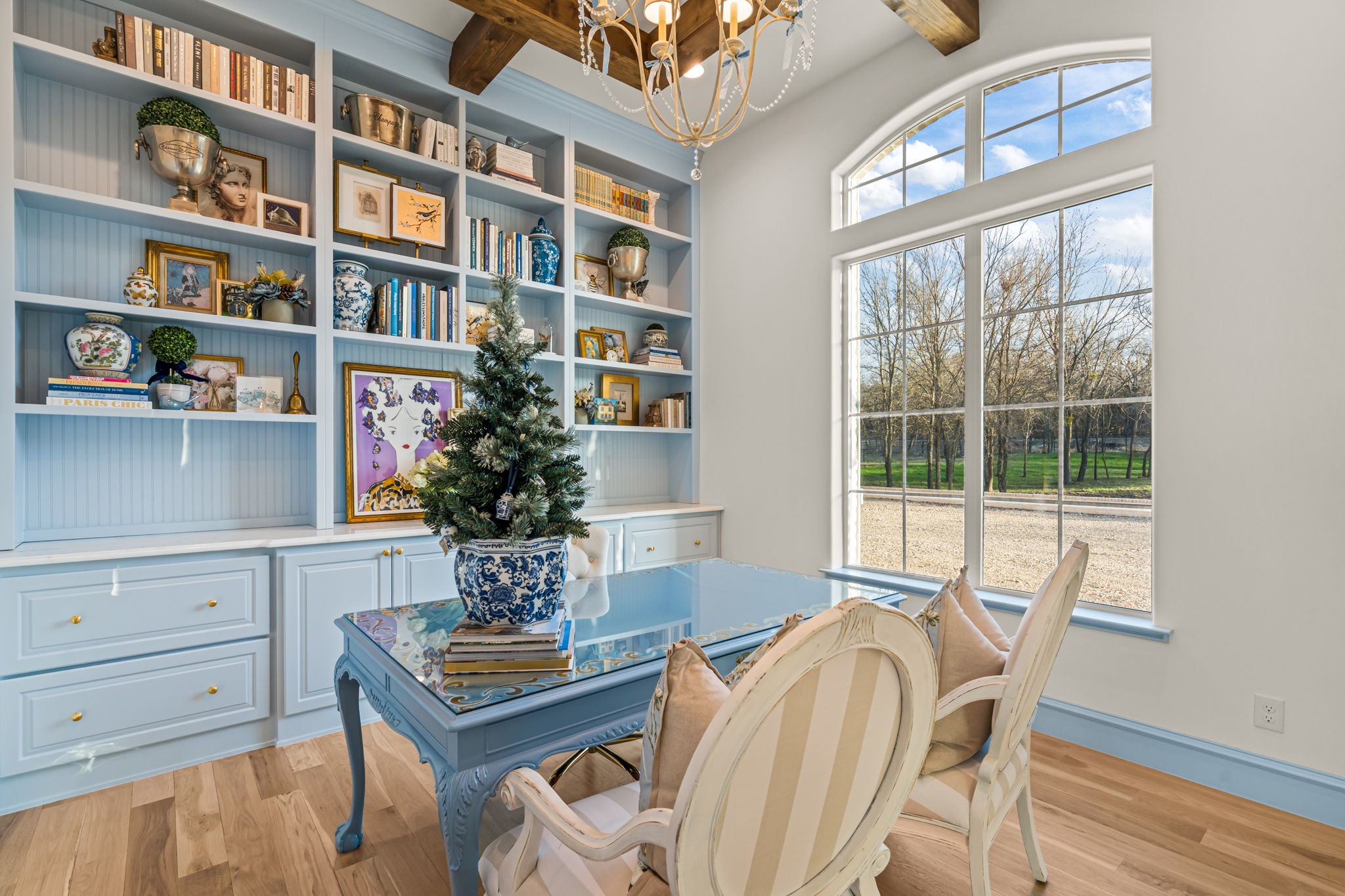 Tucked behind beautiful private gates and a canopy of towering trees on 10 pristine acres in Aledo, this extraordinary French Country estate offers a rare blend of privacy, craftsmanship, and thoughtful design just five minutes from Press Cafe and I-20. A grand entry foyer welcomes you with light checkered tile flooring, soaring ceilings, flanked by a formal dining room and designated study. Beyond the foyer, the home opens into the heart of the living spaces where dramatic cathedral ceilings in the living room and kitchen create an incredible sense of scale and light. The chef's kitchen, accented with warm brick and stone, features a massive island, butler's pantry, and herringbone wood floors that continue into the living area. Picturesque windows throughout fill the home with natural light and frame views of the surrounding acreage. The living room is anchored by a grand floor-to-ceiling stone fireplace, flanked by built-ins with brick accents. One of the home's most unforgettable spaces is the grand bibliotheque an extraordinary library featuring dual fireplaces, custom built-ins, a full bar with ice machine and refrigerator, creating the perfect setting for entertaining or quiet evenings. Entertainment continues with a first-floor theater room. The primary suite, features paneling, rich hardwood floors, a fireplace, while the spa-inspired bath showcases polished neutral checkered flooring, a walk-through brick shower, and a freestanding soaking tub. Separate his-and-her closets provide exceptional storage. A laundry within the primary closet adds everyday convenience. Built with exceptional efficiency, the home is fully encapsulated with spray foam insulation for year-round comfort. Additional highlights include a five-car garage, spacious guest suites, and a thoughtfully designed floor plan with no wasted space. A survey, pool renderings, and build plans are available upon request. Select furnishings are available to purchase upon request.