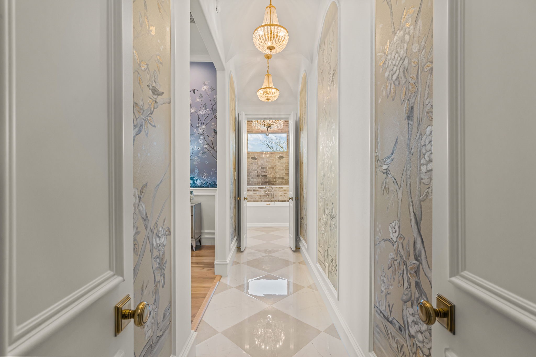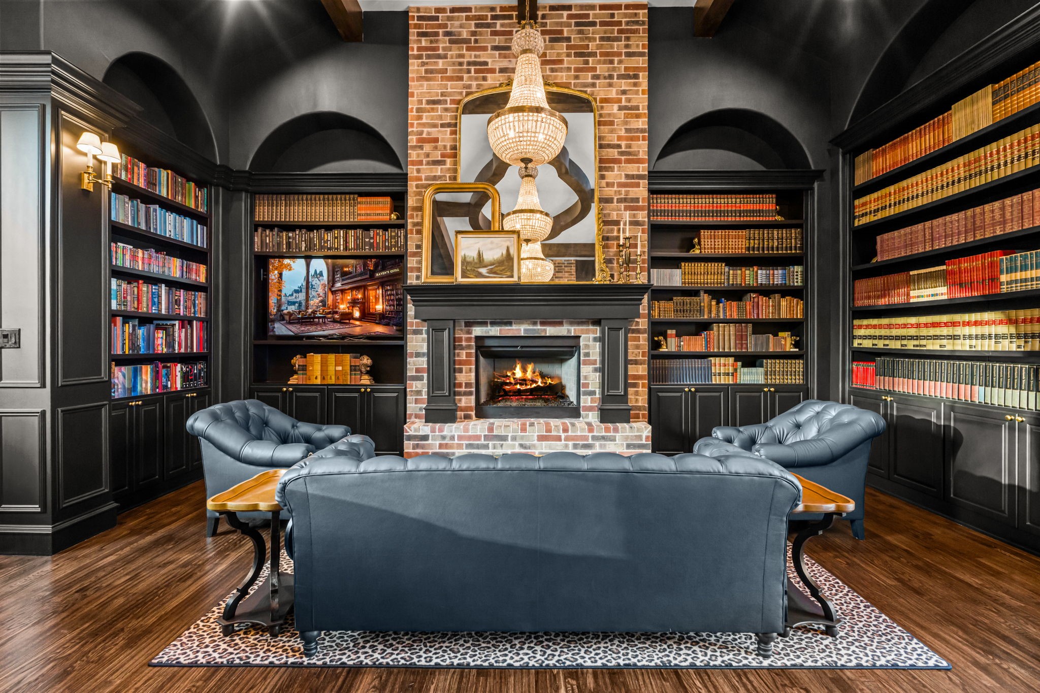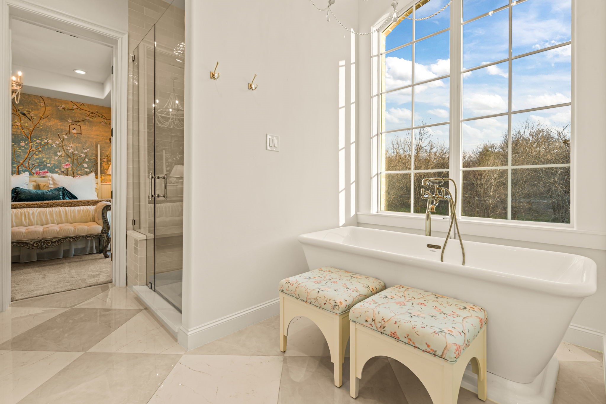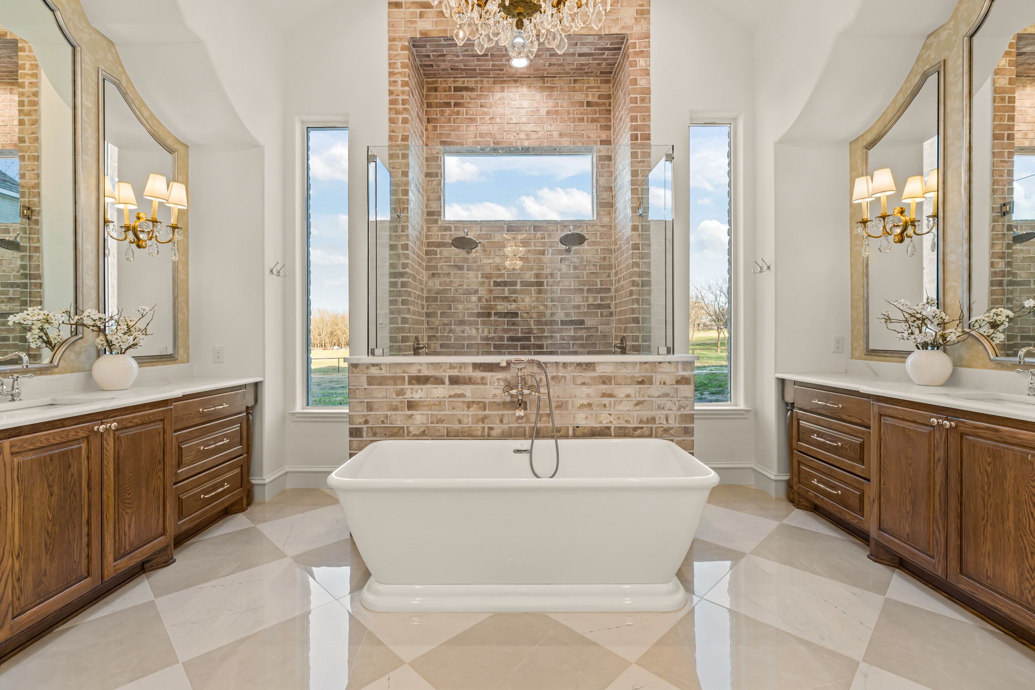 Tucked behind beautiful private gates and a canopy of towering trees on 10 pristine acres in Aledo, this extraordinary French Country estate offers a rare blend of privacy, craftsmanship, and thoughtful design just five minutes from Press Cafe and I-20. A grand entry foyer welcomes you with light checkered tile flooring, soaring ceilings, flanked by a formal dining room and designated study. Beyond the foyer, the home opens into the heart of the living spaces where dramatic cathedral ceilings in the living room and kitchen create an incredible sense of scale and light. The chef's kitchen, accented with warm brick and stone, features a massive island, butler's pantry, and herringbone wood floors that continue into the living area. Picturesque windows throughout fill the home with natural light and frame views of the surrounding acreage. The living room is anchored by a grand floor-to-ceiling stone fireplace, flanked by built-ins with brick accents. One of the home's most unforgettable spaces is the grand bibliotheque an extraordinary library featuring dual fireplaces, custom built-ins, a full bar with ice machine and refrigerator, creating the perfect setting for entertaining or quiet evenings. Entertainment continues with a first-floor theater room. The primary suite, features paneling, rich hardwood floors, a fireplace, while the spa-inspired bath showcases polished neutral checkered flooring, a walk-through brick shower, and a freestanding soaking tub. Separate his-and-her closets provide exceptional storage. A laundry within the primary closet adds everyday convenience. Built with exceptional efficiency, the home is fully encapsulated with spray foam insulation for year-round comfort. Additional highlights include a five-car garage, spacious guest suites, and a thoughtfully designed floor plan with no wasted space. A survey, pool renderings, and build plans are available upon request. Select furnishings are available to purchase upon request.