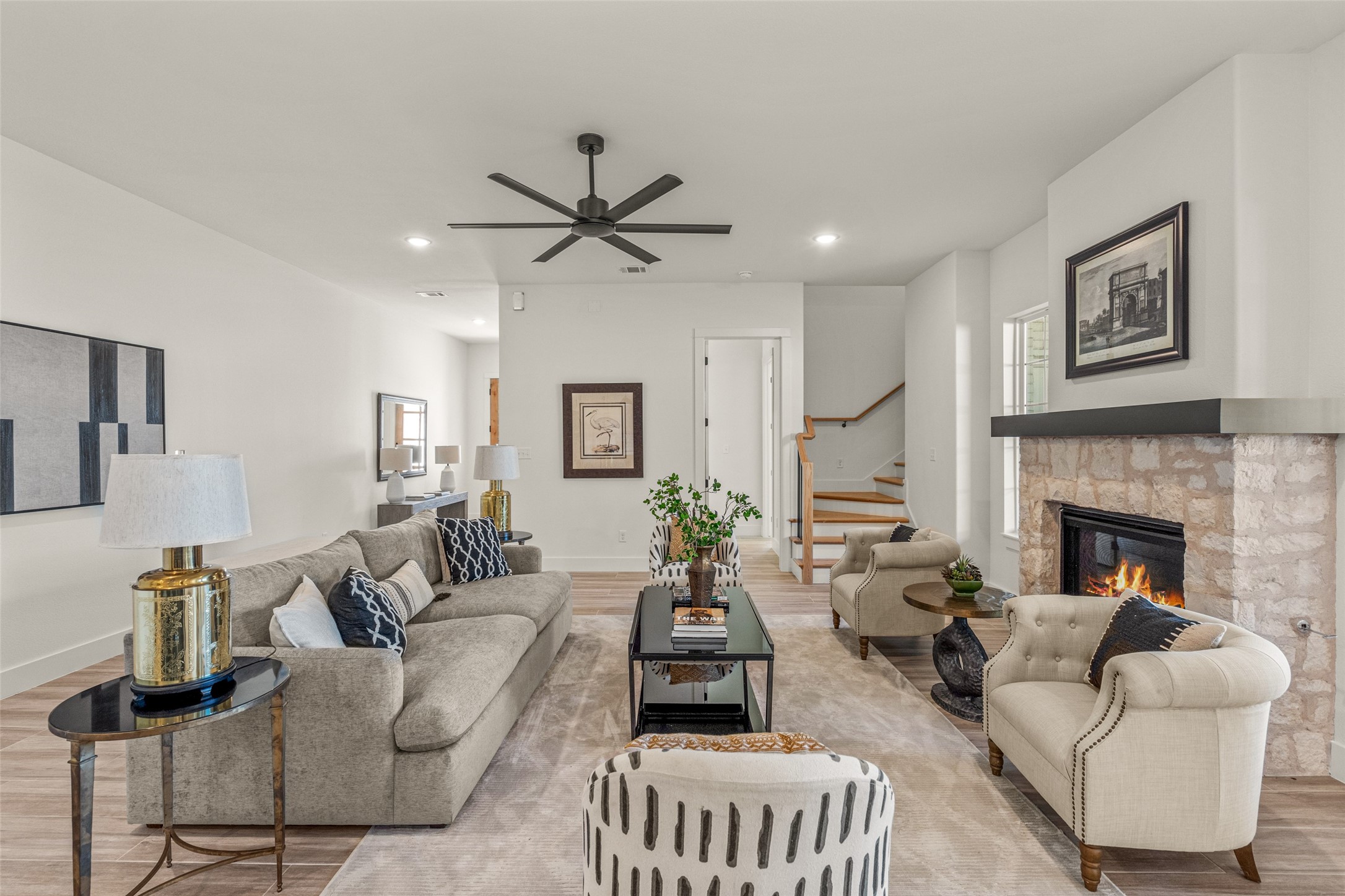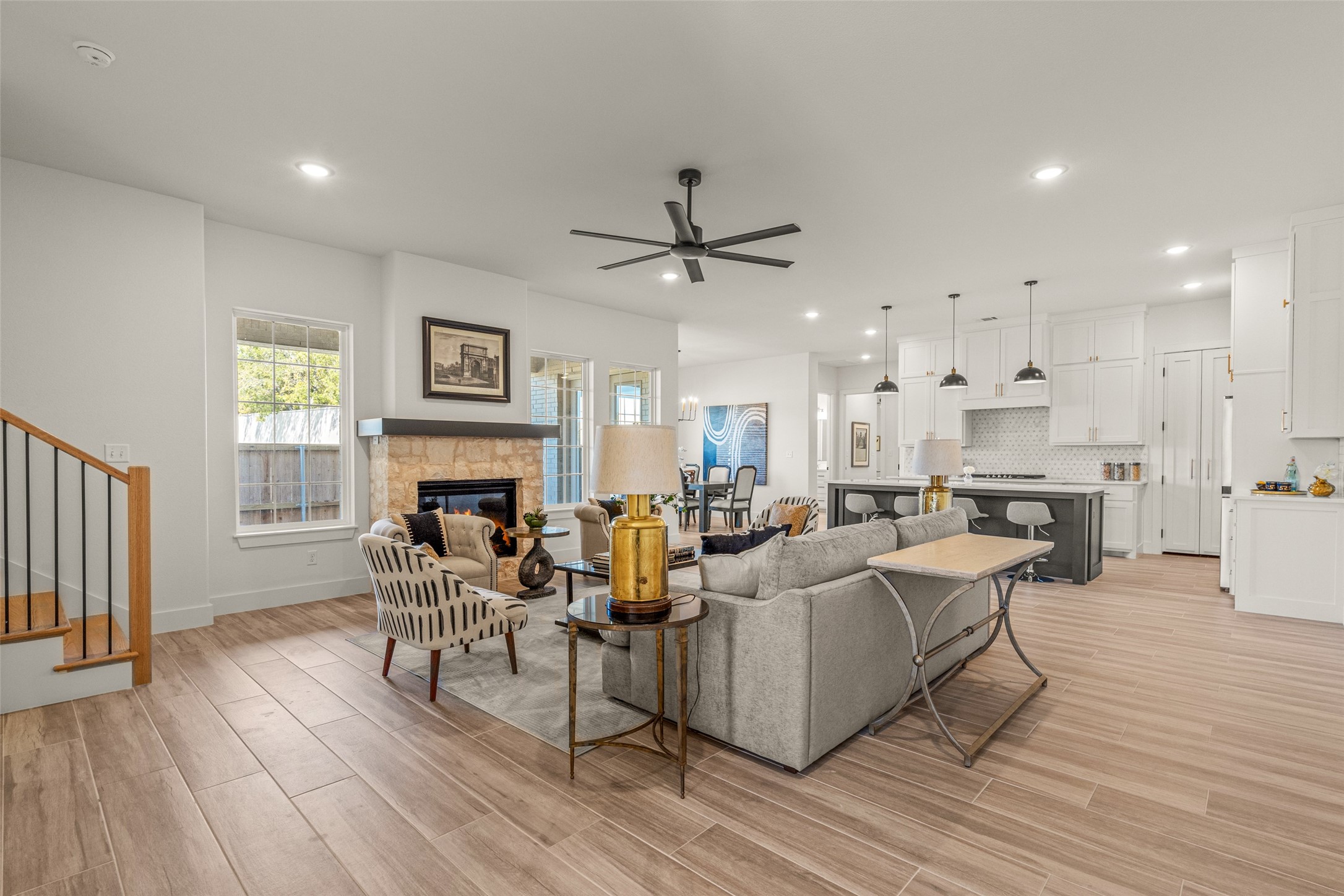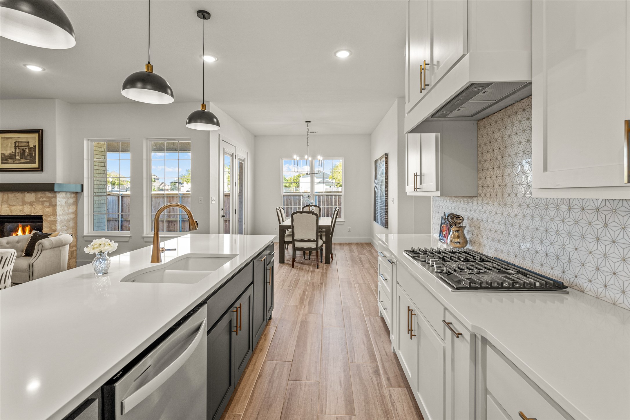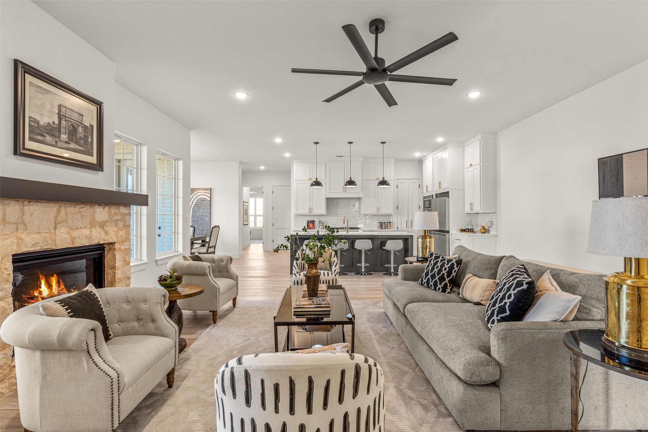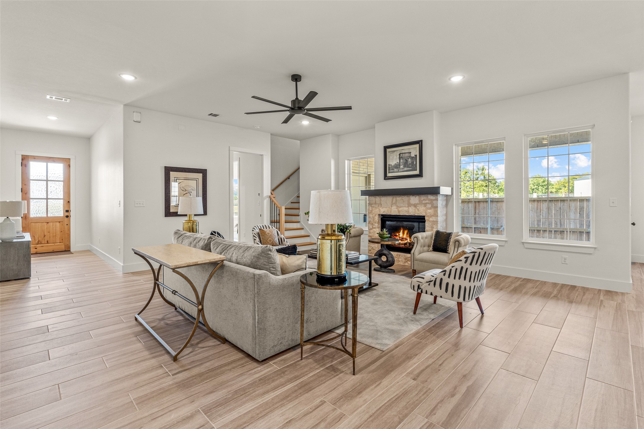 This beautiful townhome offers the perfect blend of luxury and convenience in the heart of downtown Aledo. Featuring a charming stone exterior, this home boasts 4 spacious bedrooms, 4 full bathrooms, and a 2-car garage. The first floor includes a private primary suite with dual sinks, a soaking tub, a separate shower, and a custom walk-in closet, along with an additional guest bedroom that can easily serve as an office. The open kitchen, living, and dining area is designed for modern living and entertaining. The kitchen is equipped with stainless steel appliances, a gas cooktop, microwave, refrigerator, walk-in pantry, designer backsplash, and stylish lighting. A stone, gas fireplace adds warmth and ambiance to the living room. Upstairs, you'll find a spacious game room, perfect for relaxation or entertainment, as well as an adjacent area ideal for a home office or fitness space. Two additional bedrooms, two full bathrooms, and two versatile flex spaces provide all the storage and functionality you could need. Located within walking distance to toprated schools, restaurants, shopping, and parks, 170 Hulen Circle offers a truly convenient and luxurious lifestyle.