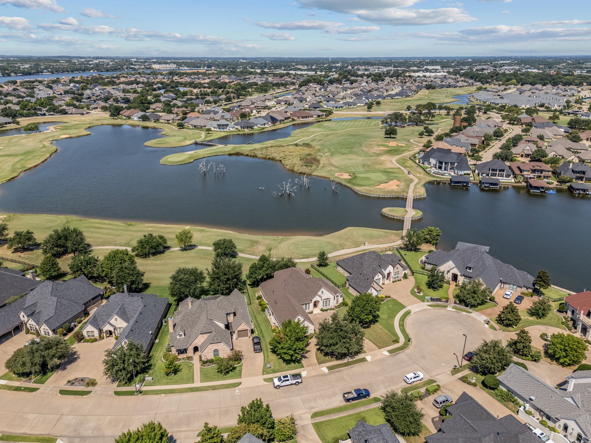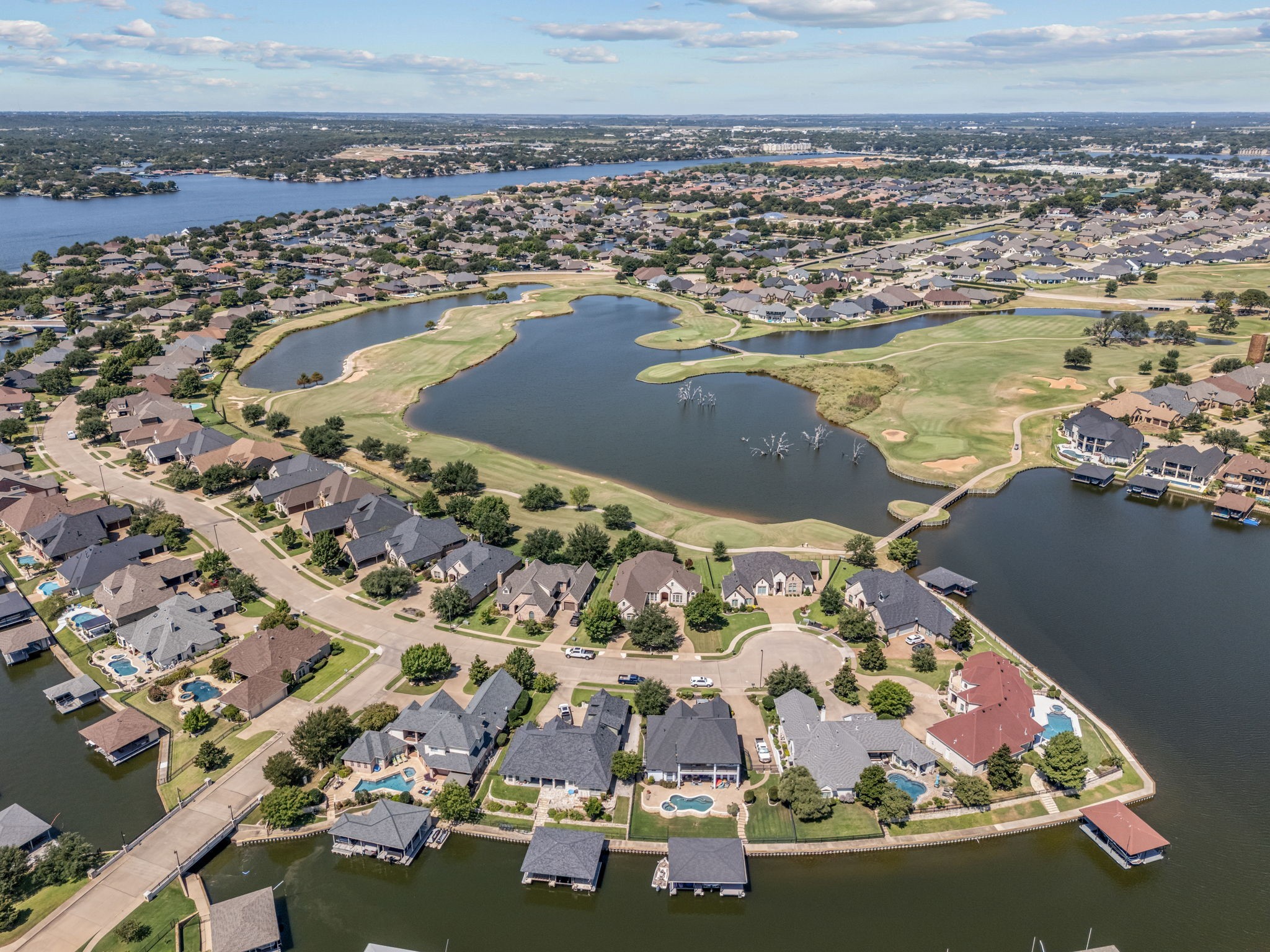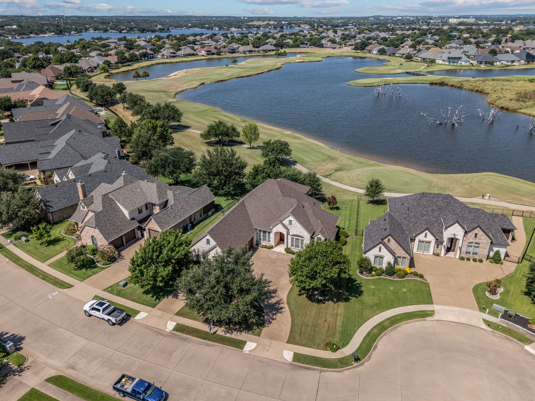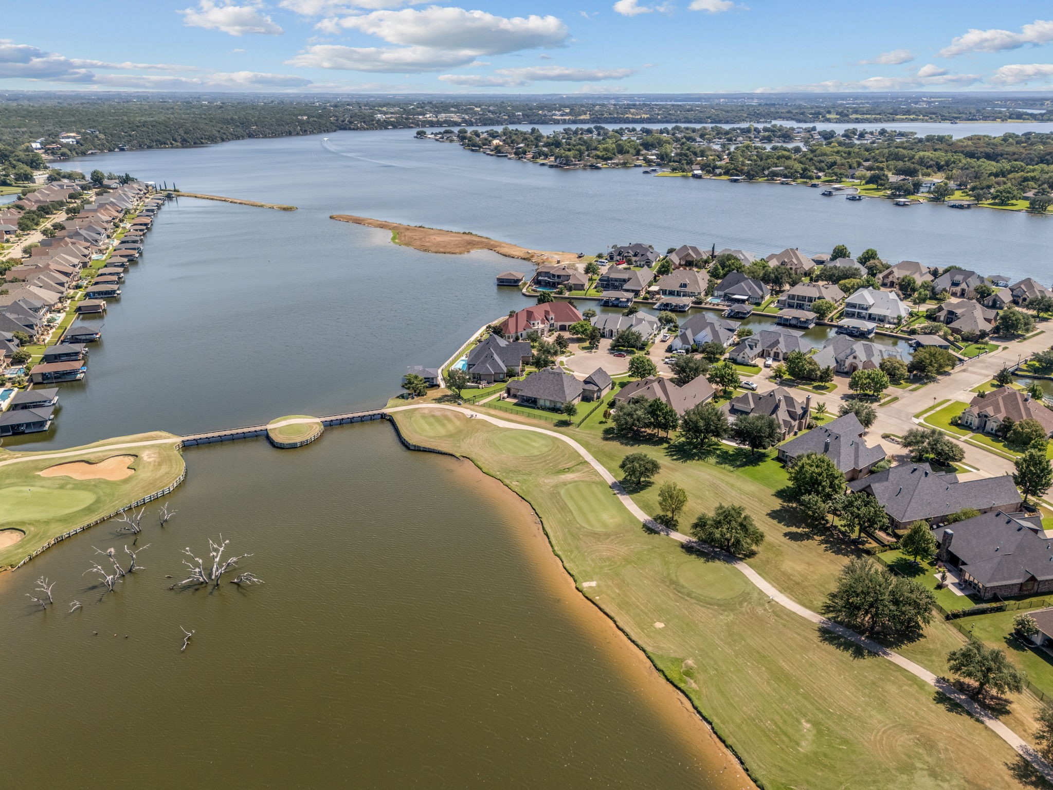 Welcome to 2703 Waters Edge in Harbor Lakes - a warm and inviting retreat overlooking the serene waters of Lake Granbury and the 14th tee box of Harbor Lakes Golf Club, with sweeping lake and fairway views from most rooms in the home. Inside, the thoughtful floor plan features both formal and casual dining areas, along with a spacious open kitchen with granite countertops, a center island, and breakfast bar. The kitchen flows effortlessly into the dining and living spaces, where a cozy fireplace and bar area create the perfect setting for entertaining. A private study and two main-level primary suites provide exceptional flexibility and privacy. Upstairs, a large living-game room with wet bar, balcony access, and ensuite bedroom is ideal for guests or family. A generous bonus room adds even more versatility--perfect for a playroom, craft studio, workout area, or a combination of all three. Outdoor and garage features include a circular drive, a 3-car garage with a dedicated golf cart bay that opens directly to the back for instant course access, plus a wall of built-in shelving and cabinets. Additional highlights include two cedar closets, a brand-new roof (August 2025), and three new AC units (2020). This Harbor Lakes gem blends comfort, convenience, and an unmatched golf course lifestyle--complete with amazing golf and water views ! BONUS - Community boat launch for Harbor Lake residents!