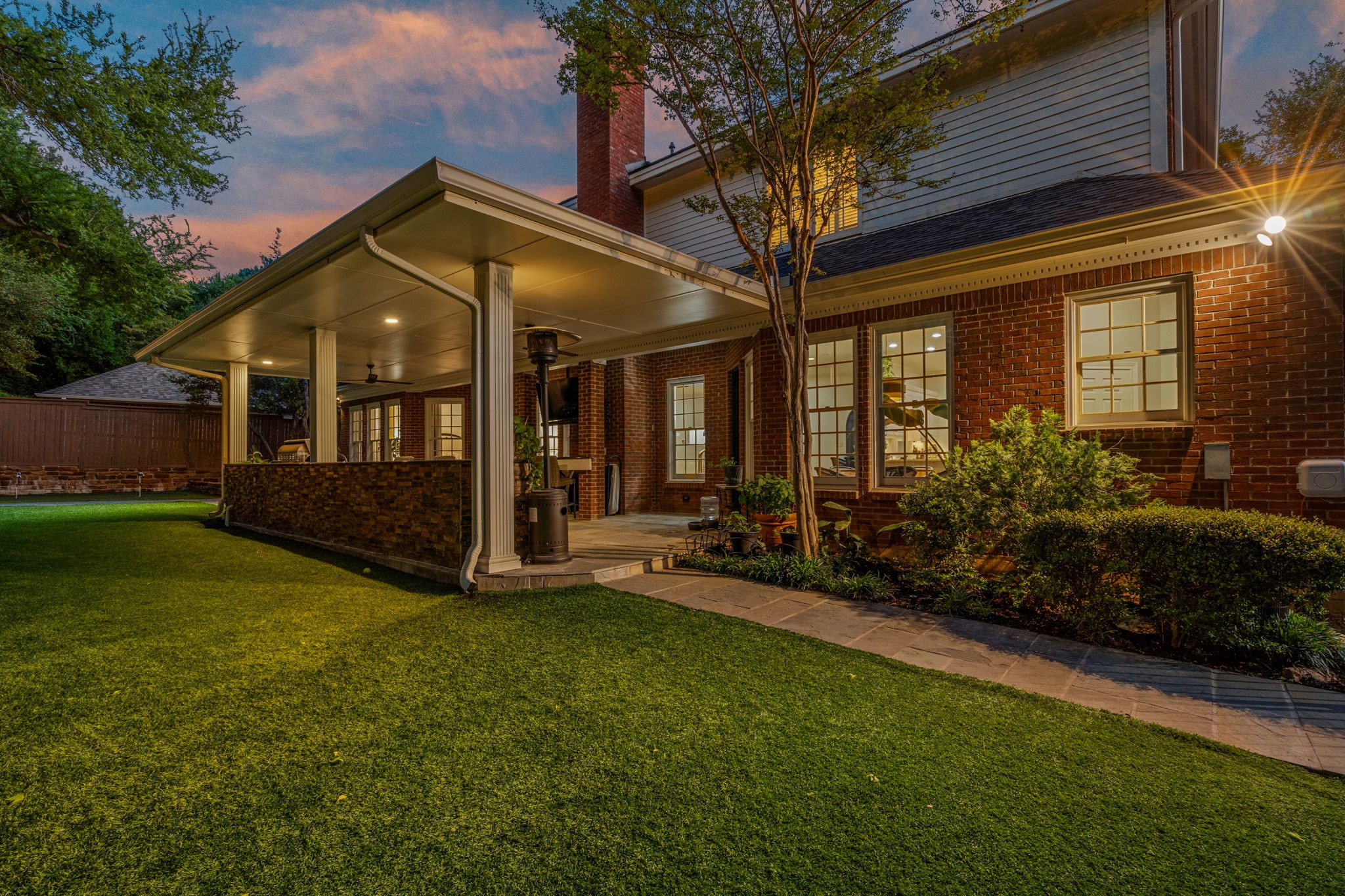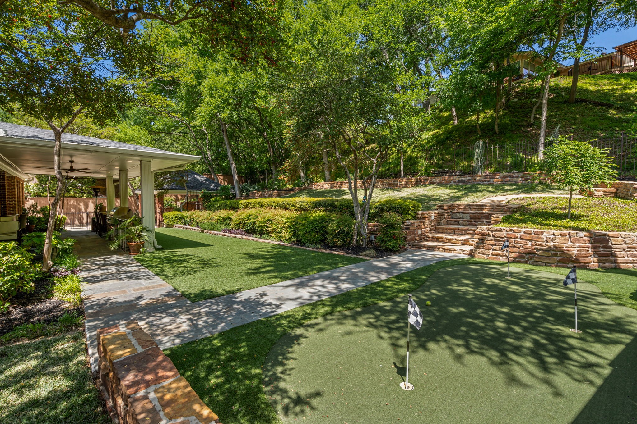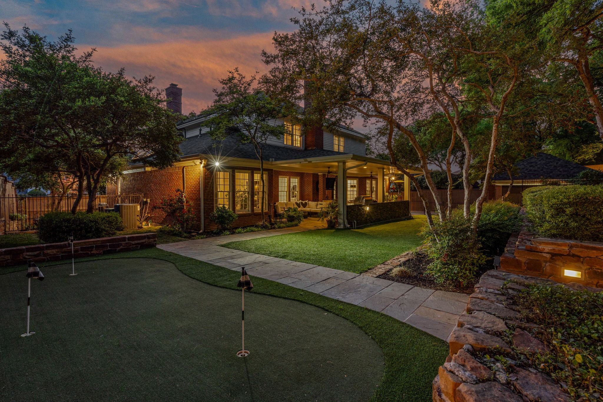 Nestled in the prestigious Overton Woods neighborhood, this stately Georgian-style residence offers timeless architecture paired with modern luxury. Updated in 2023-2024, the home is surrounded by lush landscaping, mature trees, and a circular drive that sets an impressive tone from the moment you arrive. A grand two-story foyer gracefully separates the formal living and dining areas. The family room opens to the kitchen and breakfast nook, creating a comfortable and seamless flow between the spaces, with a conveniently located half bath for guests. The kitchen features a breakfast bar, central island, walk-in pantry, and a coffee and wine bar complete with a sink and wine refrigerator. The spacious primary suite is located on the main level with views of the backyard and direct patio access. The light-filled en-suite bath boasts dual sinks, a separate soaking tub, walk-in shower, and dual closets. Upstairs, four bedrooms are thoughtfully arranged with two Jack-and-Jill bathrooms, while the third floor offers a versatile bonus room ideal as a game room, office, or additional living space. Step outside to a serene backyard retreat, where a covered outdoor living and grilling area--featuring two bar tops--overlooks a beautifully manicured yard with lush turf and a private putting green, ideal for both relaxation and entertaining. Additional highlights include a generous utility room, half bathroom, mosquito misting system, new class 4 impact resistant roof and gutters in 2023, a two-car garage, and a separate covered parking area accommodating two additional vehicles. Zoned to highly acclaimed Overton Park Elementary and minutes from premier shopping, dining, entertainment, and major thoroughfares, this exceptional home offers both elegance and everyday convenience.