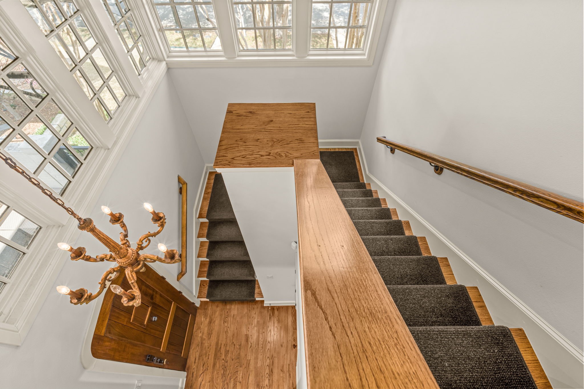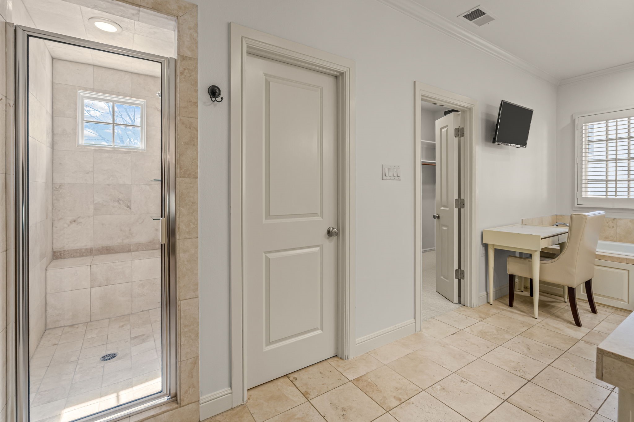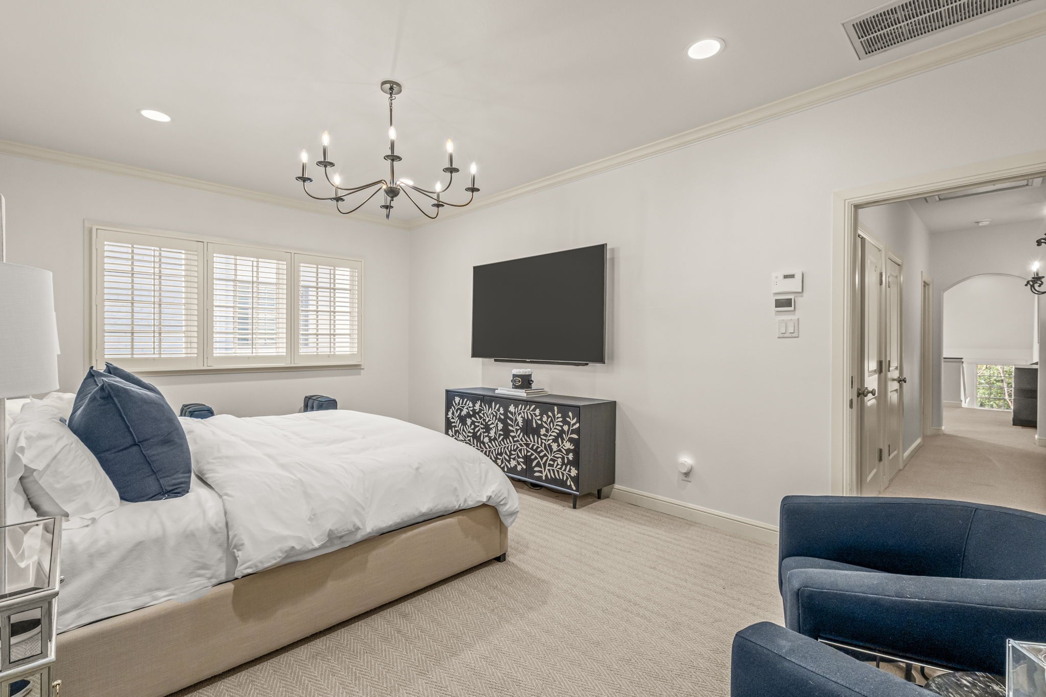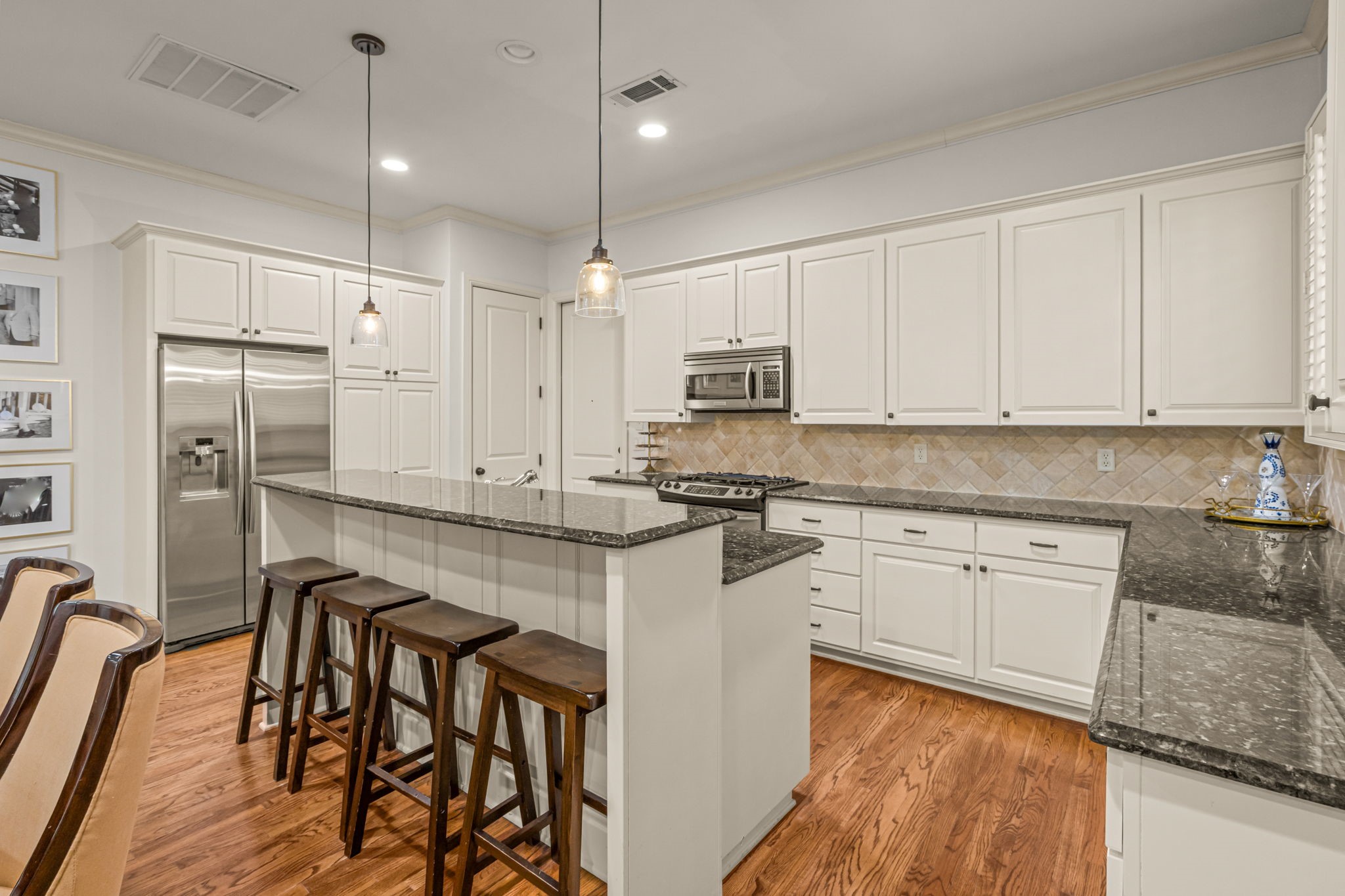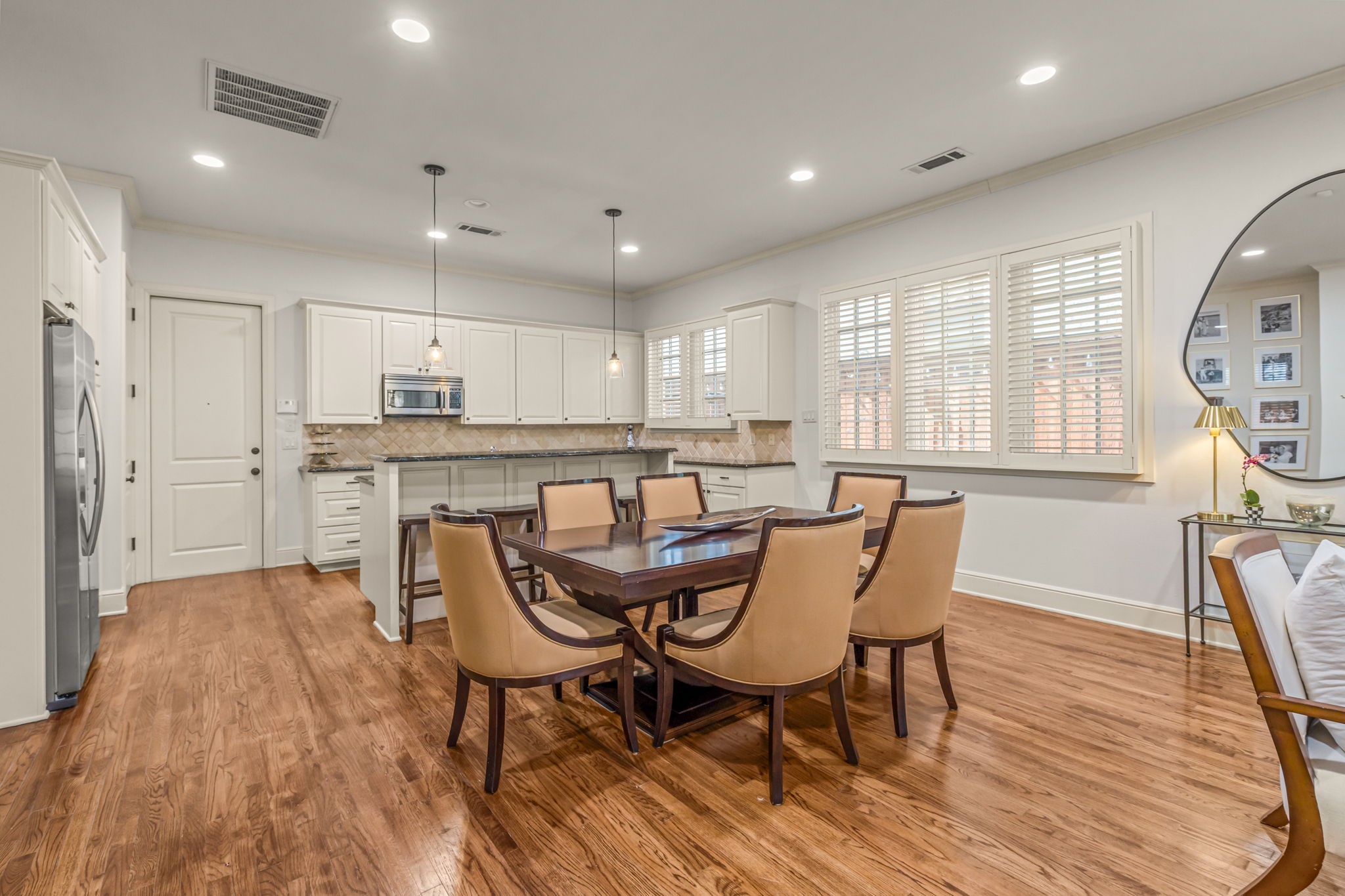 From the moment you arrive, the private front patio creates a warm yet sophisticated welcome--perfect for morning coffee or evening wine. The first level unfolds into an open-concept living, dining, and kitchen arrangement designed for both elevated entertaining and everyday comfort. Rich hardwood flooring flows throughout, complemented by an impressive array of custom built-ins offering both beauty and function, while every window is adorned with elegant, custom-crafted plantation shutters--adding architectural refinement and timeless sophistication to each space. The thoughtfully positioned powder bath completes the main level.
