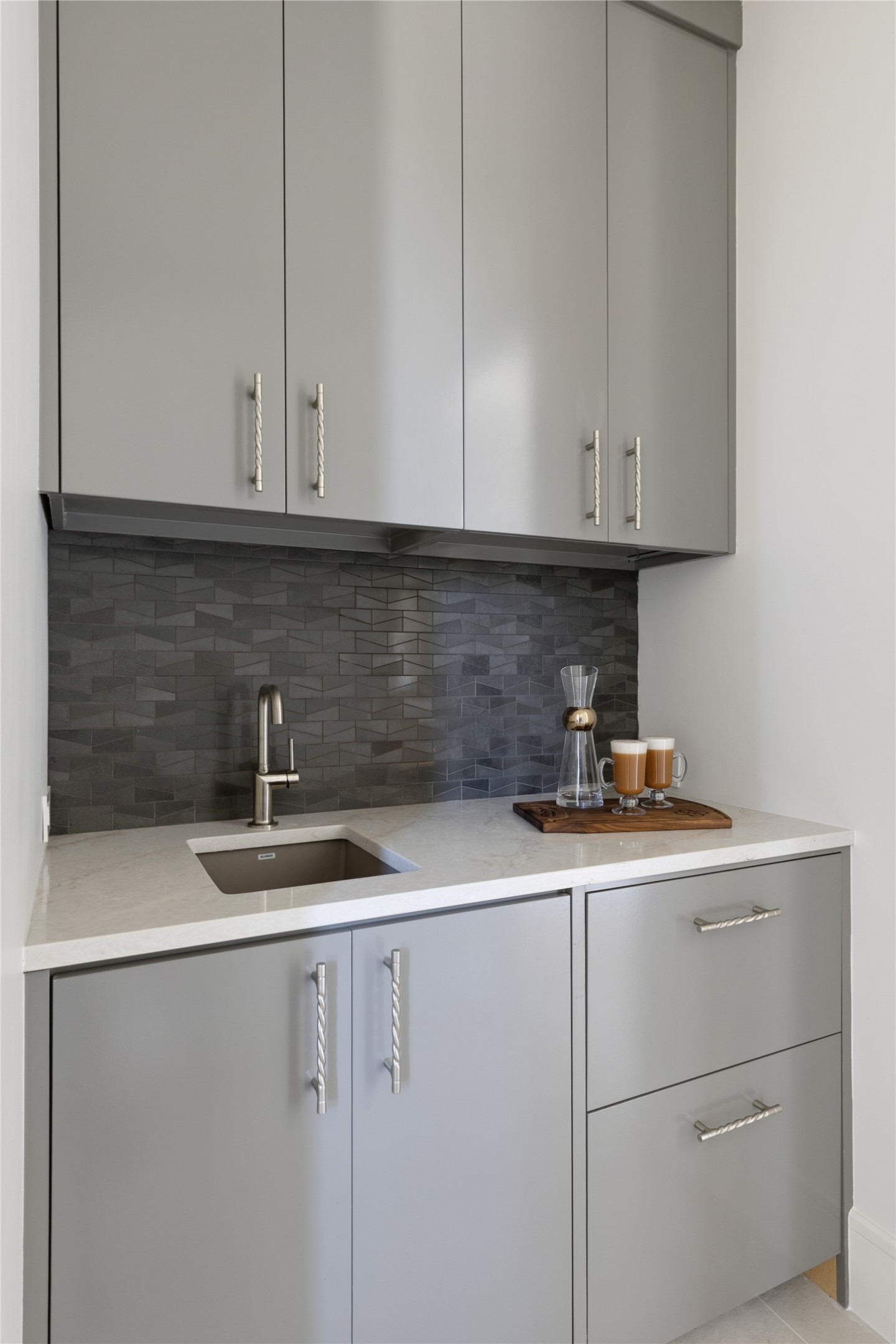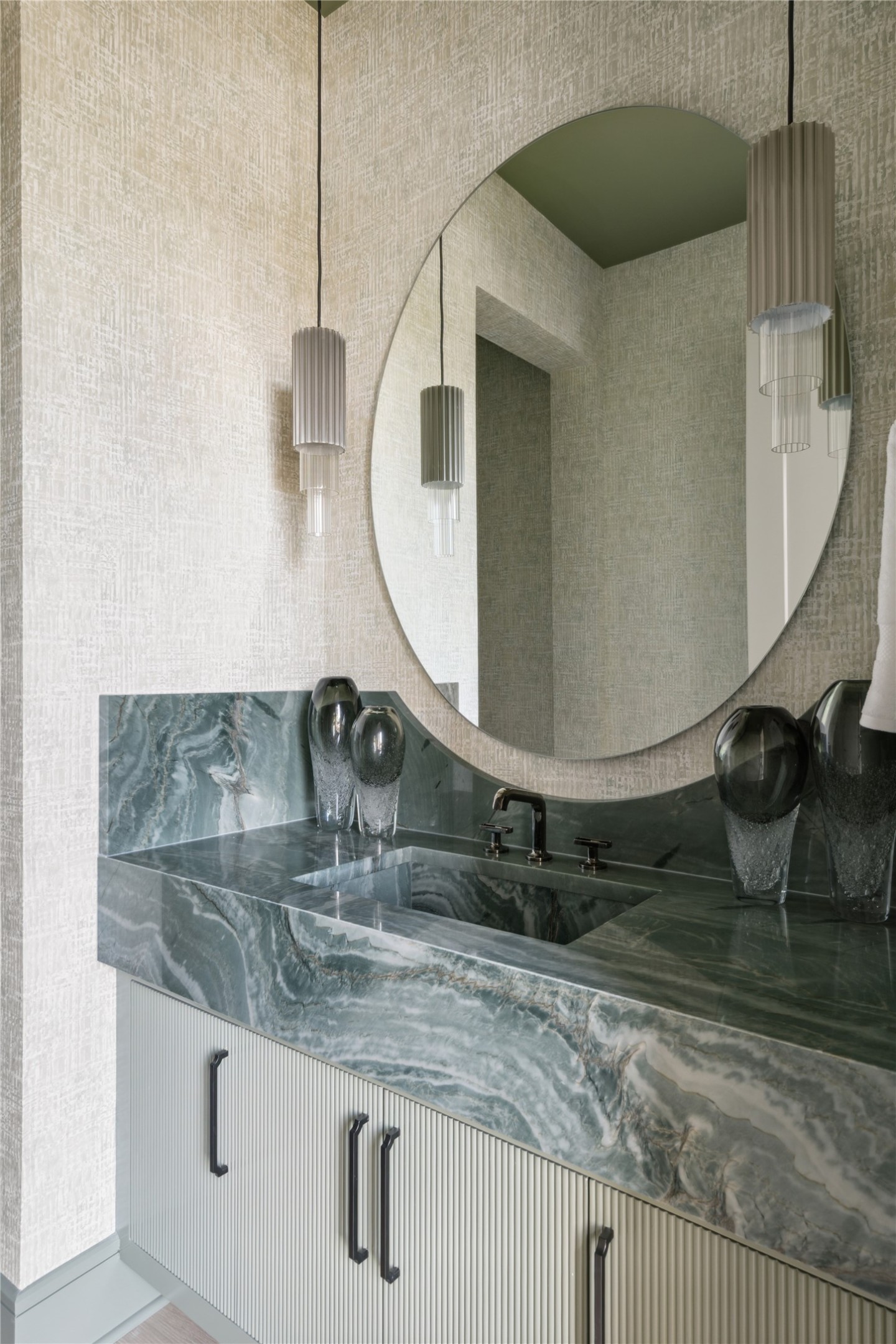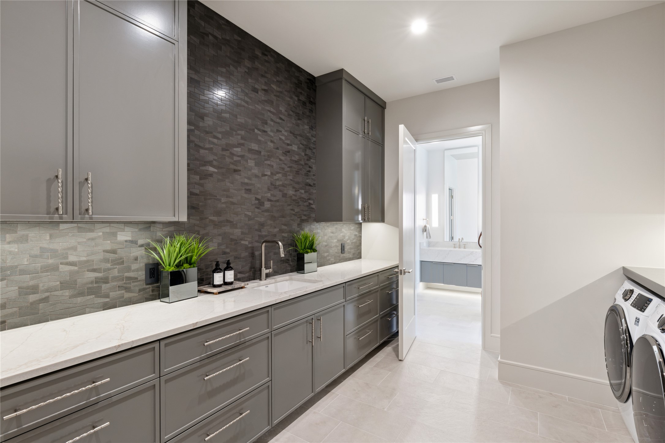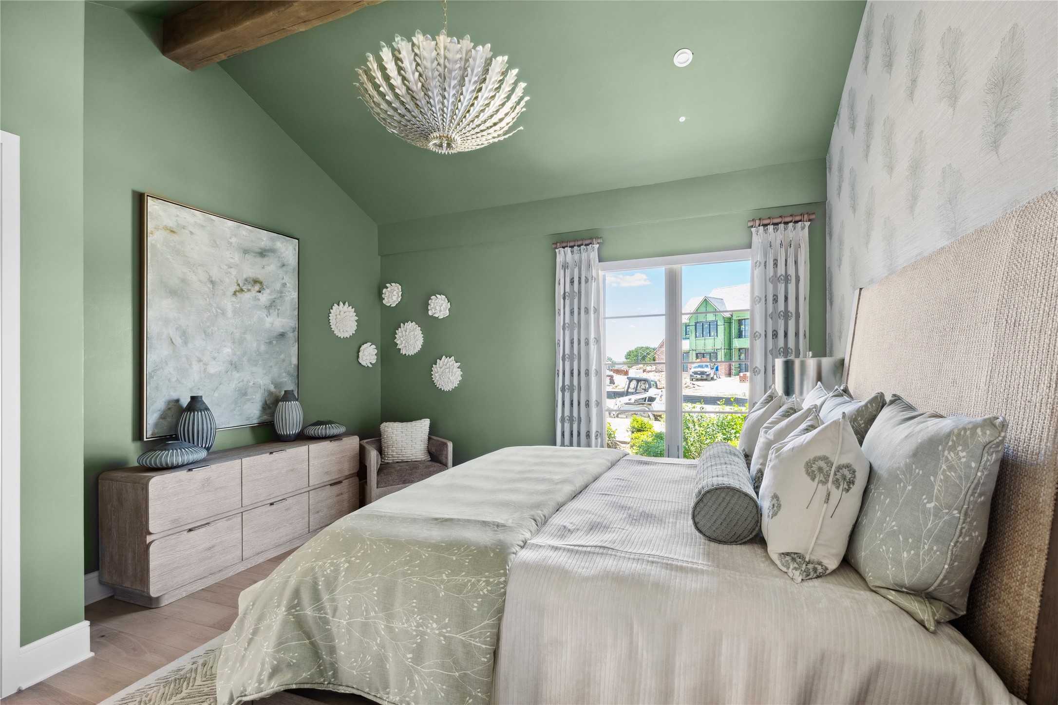 Architectural details include rustic stonework and distressed wood accents with a modern twist. The home's clean exterior lines, metal accents, and limewashed finishes lend a timeless character, while the interior embraces soft greens, earth tones, and vineyard-themed color palettes--chardonnay, merlot, and cognac--infusing every space with a sense of warmth and lived-in luxury.