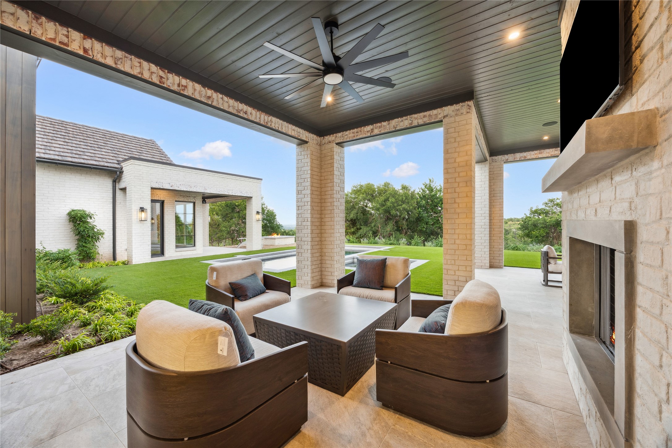Outside, the amenities continue with a fully equipped outdoor kitchen, covered living area, and a sparkling pool--all framed by sweeping skyline views.