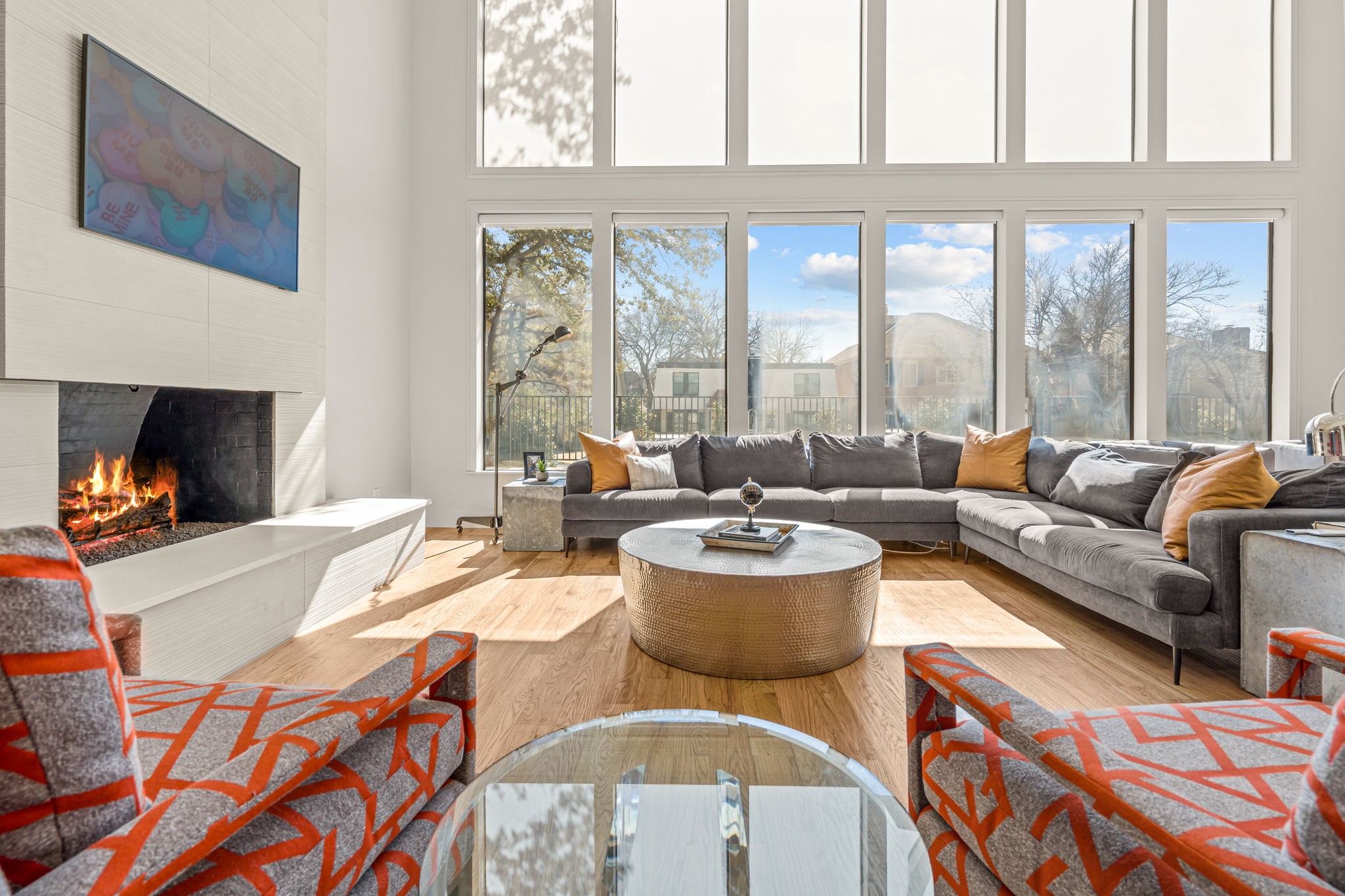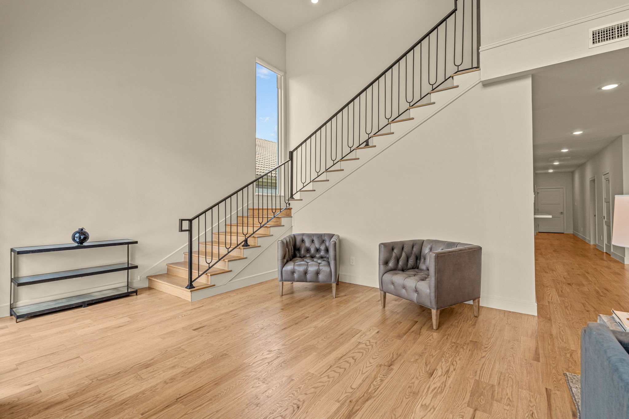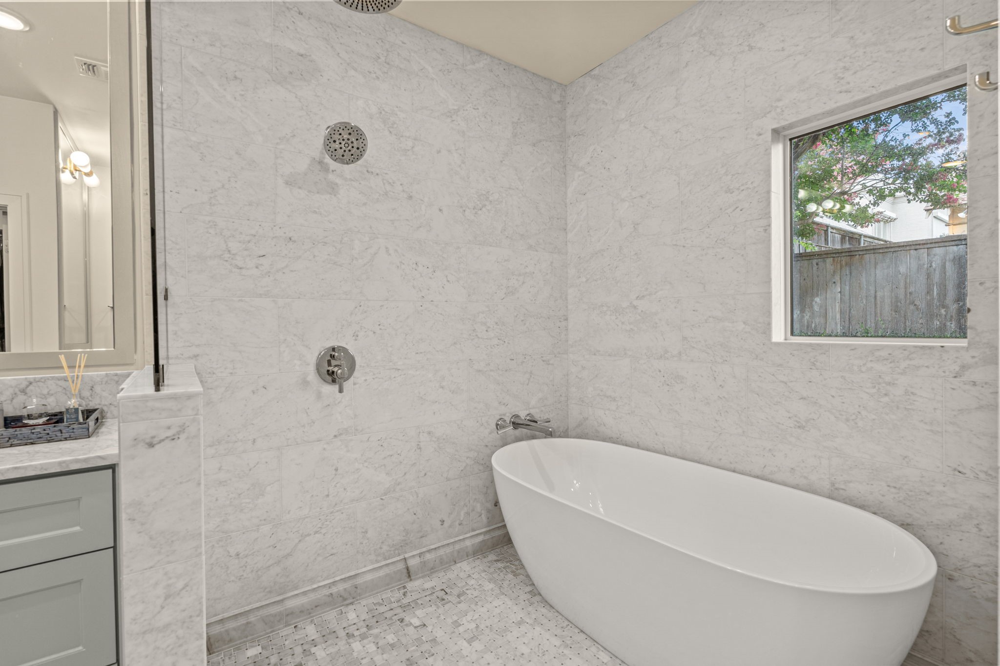 The primary suite is a true retreat with a spa-like bath--complete with soaking tub, rainfall shower, dual vanities, and custom walk-in closet. A downstairs guest suite lives like a second primary. Automatic blinds add convenience throughout the main living spaces, along with a chic centrally located powder bath.