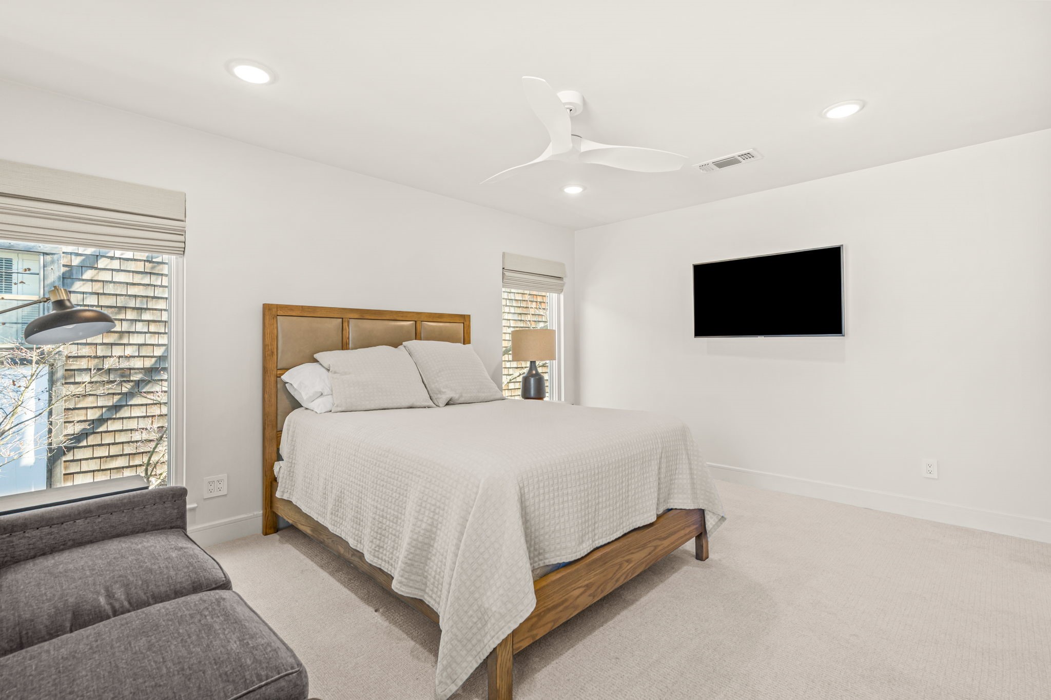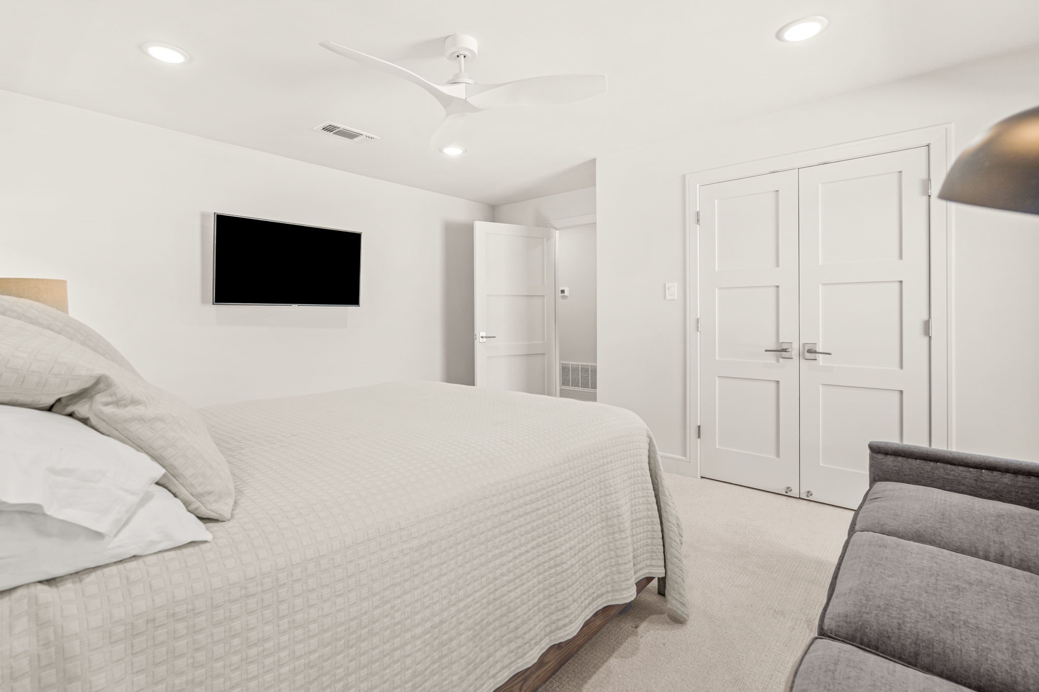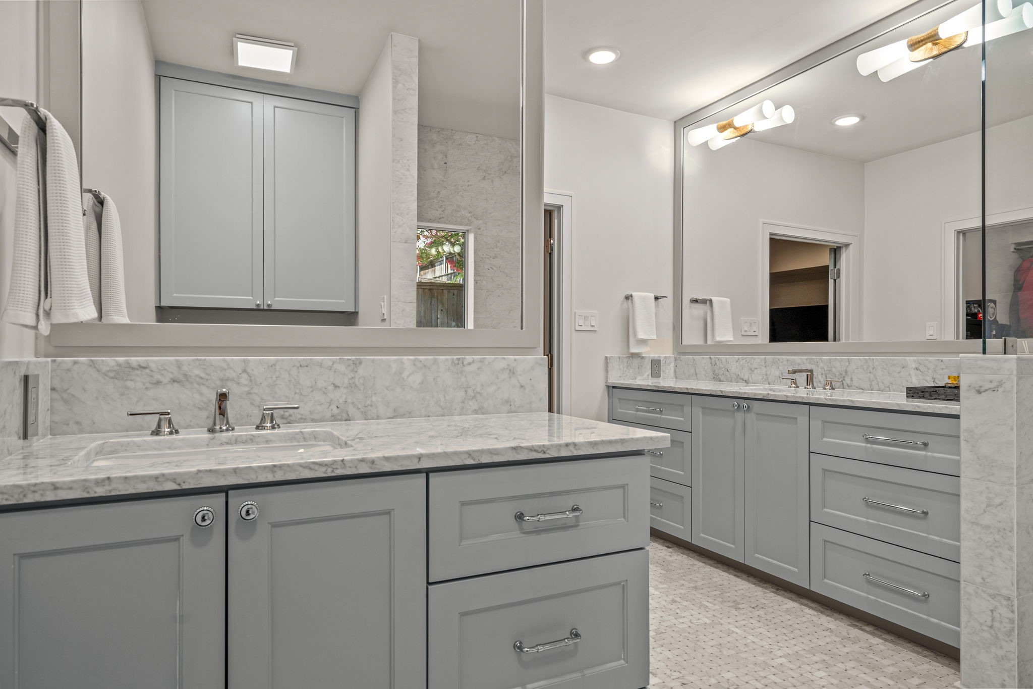 The primary suite is a true retreat with a spa-like bath--complete with soaking tub, rainfall shower, dual vanities, and custom walk-in closet. A downstairs guest suite lives like a second primary. Automatic blinds add convenience throughout the main living spaces, along with a chic centrally located powder bath.