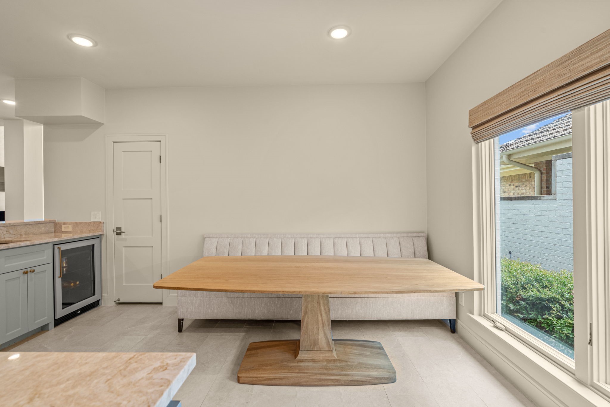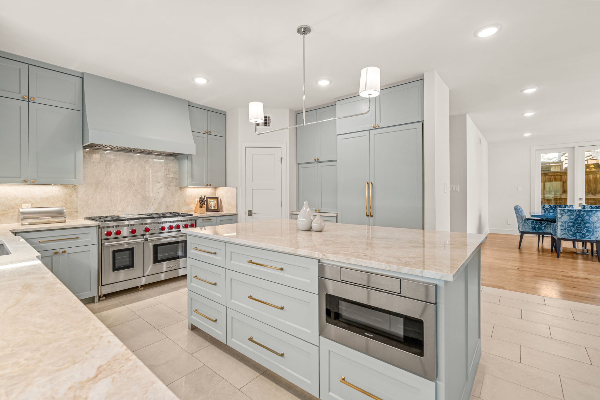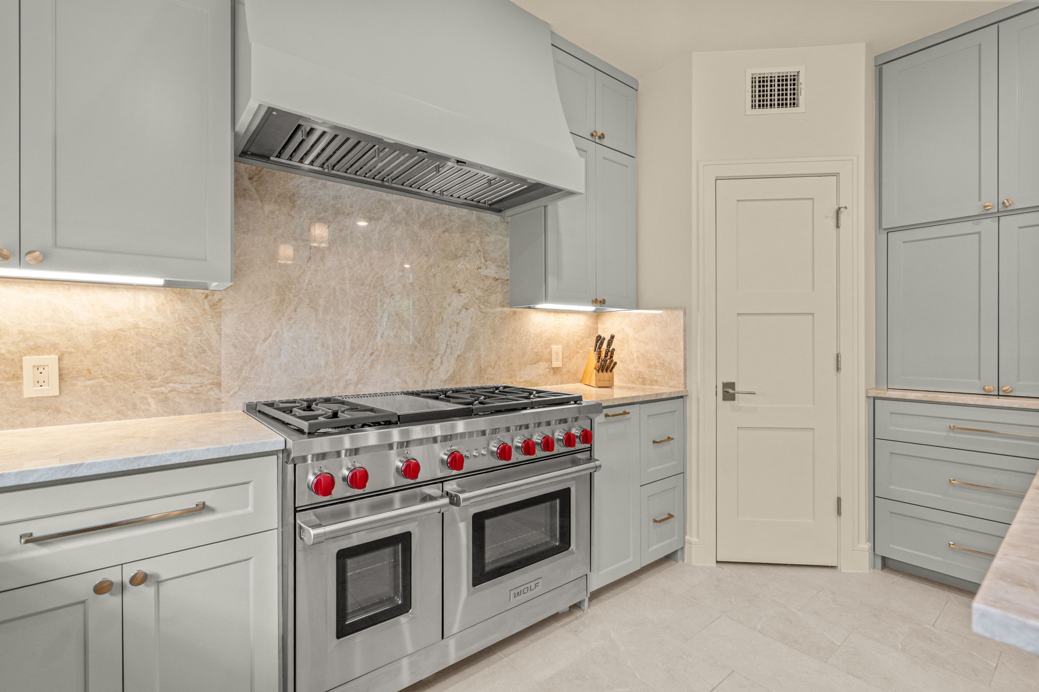 The main level features soaring ceilings in the foyer and living room, a showstopping kitchen with Taj Mahal quartzite countertops and full-height backsplash, top-of-the-line appliances including a Wolf range and built-in Jenn-Air refrigerator, and a full wet bar with wine fridge and ice maker. Enjoy everyday meals in the spacious kitchen dining area and host guests in the formal dining room that seats up to 10.