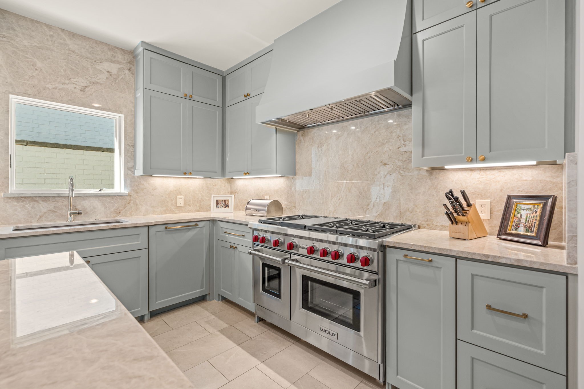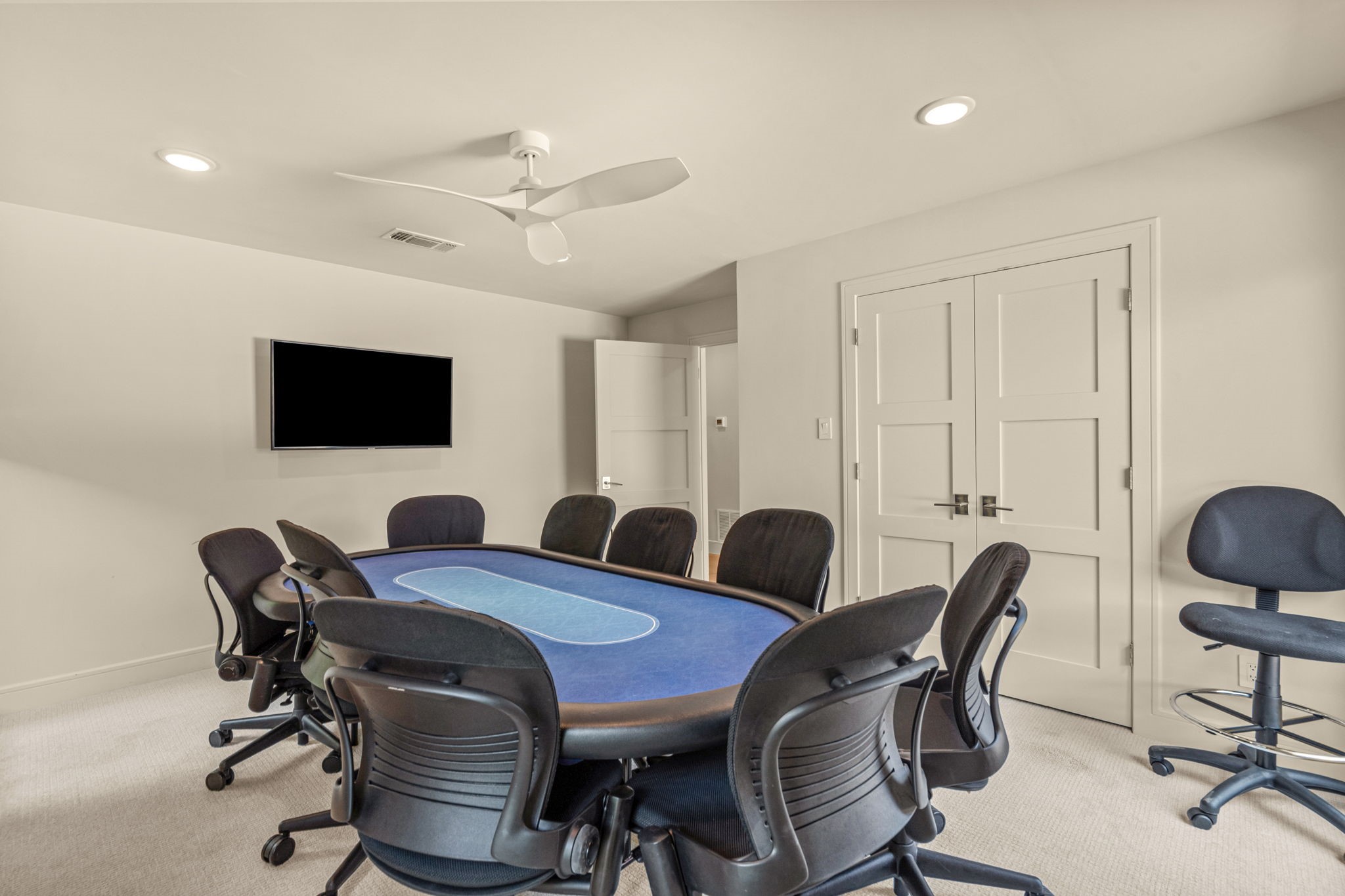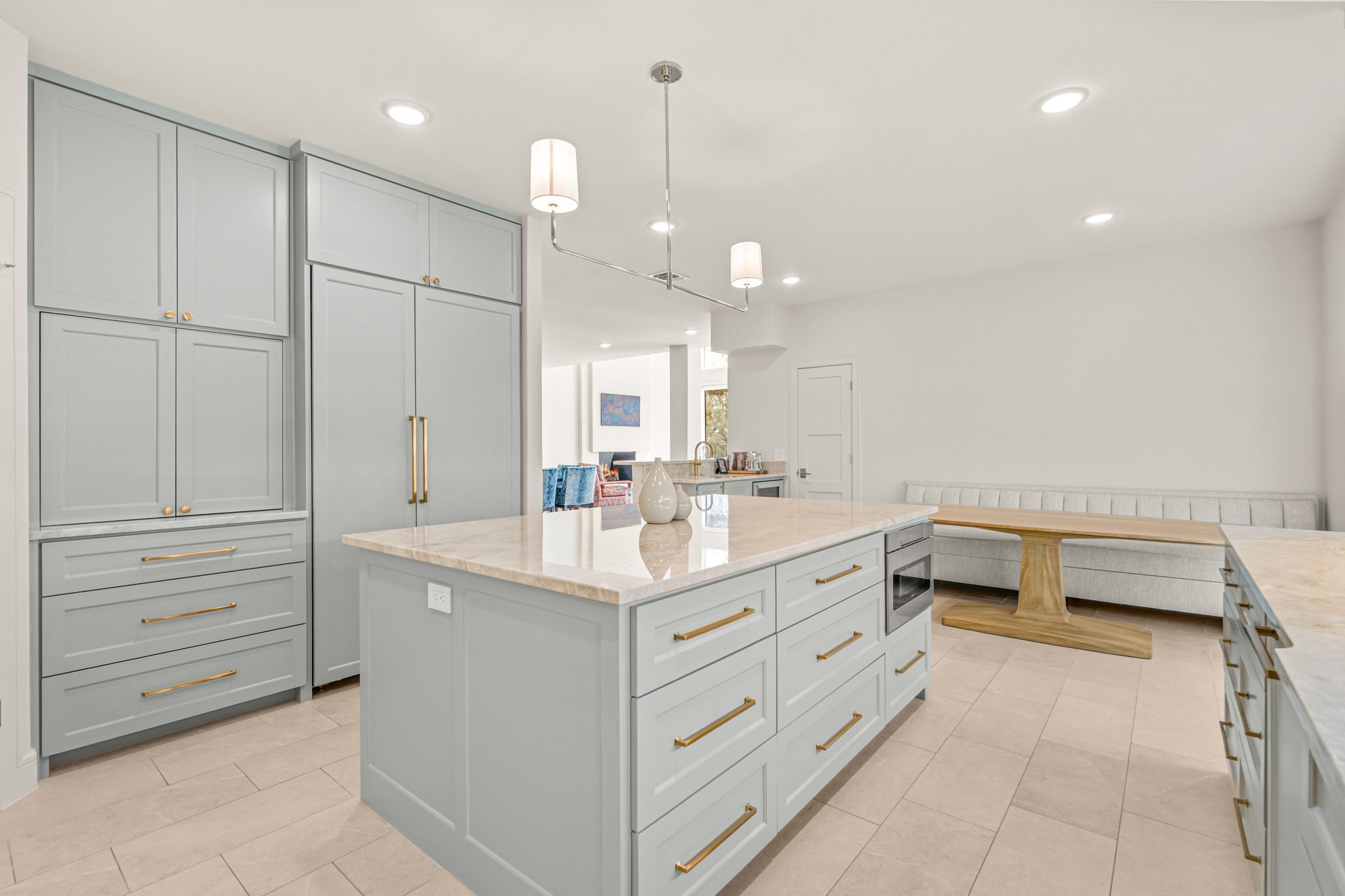 The main level features soaring ceilings in the foyer and living room, a showstopping kitchen with Taj Mahal quartzite countertops and full-height backsplash, top-of-the-line appliances including a Wolf range and built-in Jenn-Air refrigerator, and a full wet bar with wine fridge and ice maker. Enjoy everyday meals in the spacious kitchen dining area and host guests in the formal dining room that seats up to 10.