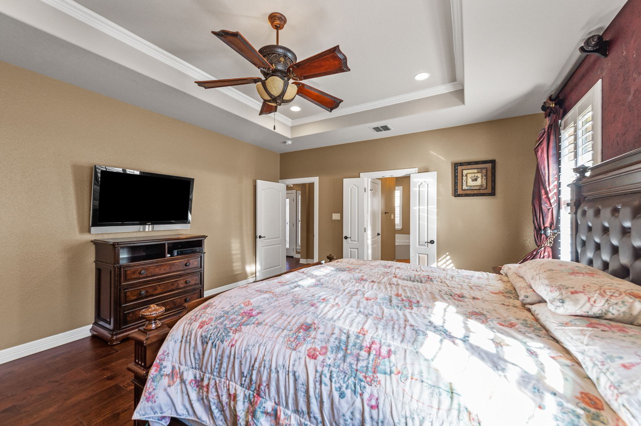 Entering through a charming courtyard, this 3 bed 2 bath supplies a fantastic floorplan. Living area with 11-foot ceilings and has an adjoining dining area with hardwood floors, a gas burning fireplace & plantation shutters. Kitchen includes double ovens, a breakfast island, & walk-in pantry. The primary bedroom is generously sized has an ensuite bath with separate tub and shower & large master closet. The two additional bedrooms are separated by a study with built ins. Top notch outdoor kitchen that includes a built-in grill, ice box, griddle, & bar top. Finished garage with tile floors, accent paint and plantation shutters. The neighborhood of Reata West has quiet streets and a gated entry.