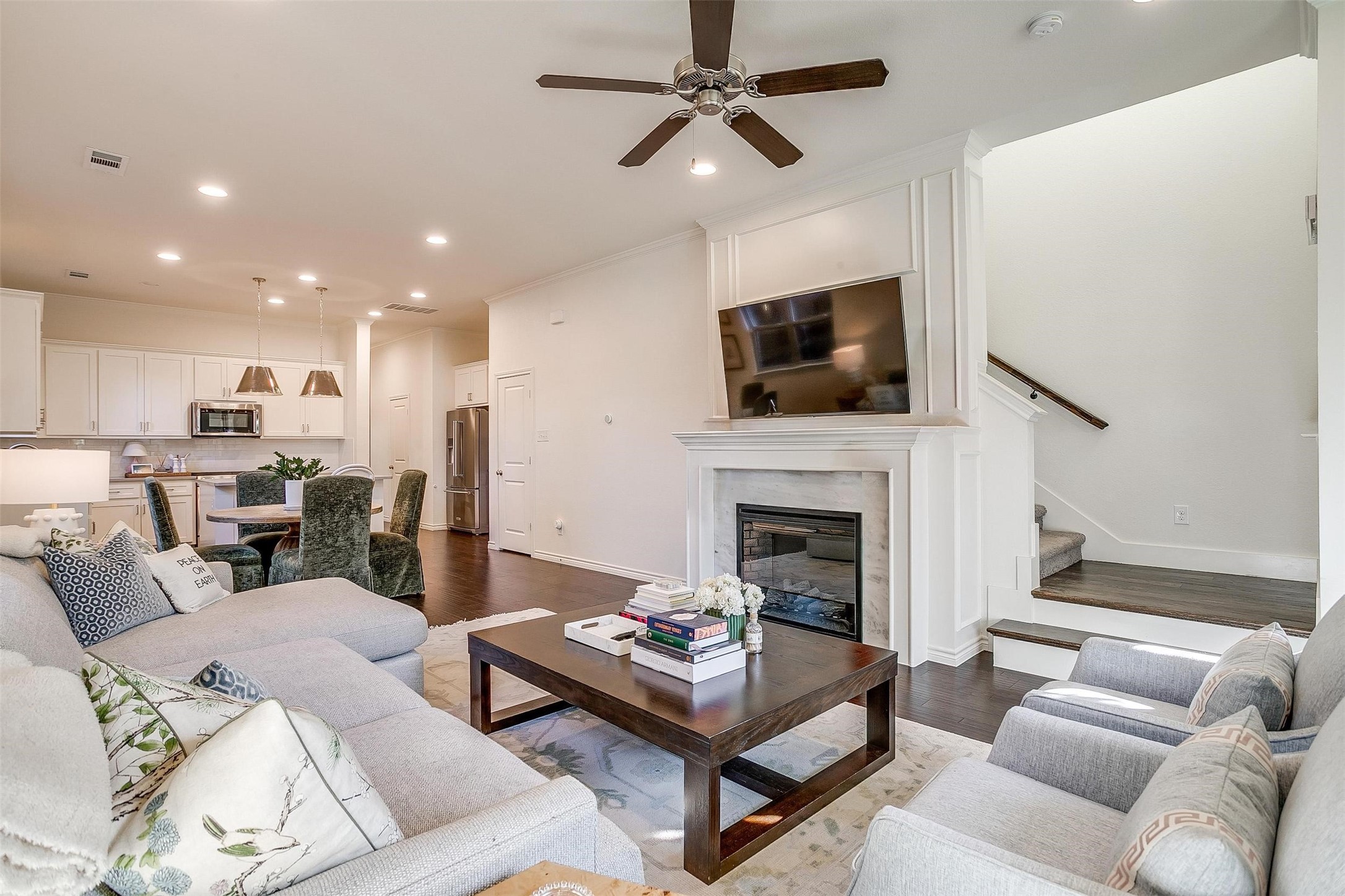 Inside, the open-concept layout is filled with natural light and designed for both everyday living and entertaining. The kitchen features quartz countertops, KitchenAid stainless steel appliances, a built-in wine refrigerator, and generous prep space that flows seamlessly into the main living area. The living room is centered around an electric fireplace, creating a comfortable place to gather or unwind.