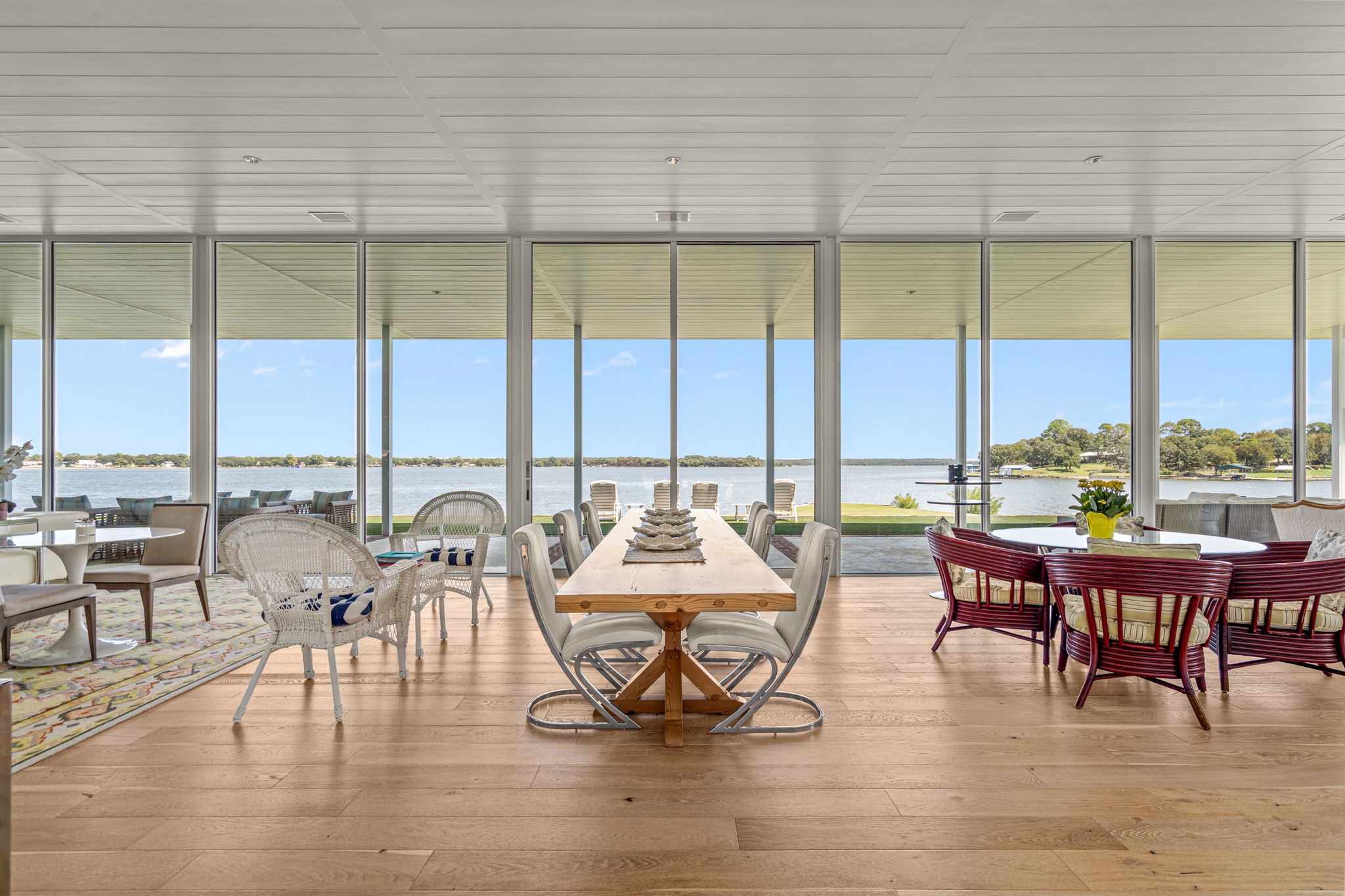 This single-story Eagle Mountain Lake retreat, designed for effortless lakeside entertaining, sits gracefully on 2.164 acres with 750 feet of waterfront. The open-concept layout is framed by floor-to-ceiling windows that showcase sweeping lake views, while a chef's kitchen boasts a marble island, Miele appliances, and four refrigerator drawers, with a laundry room that doubles as a secondary walk-in pantry. A covered porch wraps around three sides of the home, complete with a built-in bar top and serving area, and beyond the patio a manicured turf yard provides a serene setting for relaxation. The floating dock with boat and jet ski lift enhances the lakefront lifestyle. Prepared for future expansion, the home includes a large attic as well as a separate 1,200-square-foot suite nearing completion, offering panoramic views, private his-and-hers ensuites, and separate closets. Additional amenities include a gated drive with RV and boat parking, plus an Airstream, boat, and jet skis--making this the ultimate turnkey lake property.