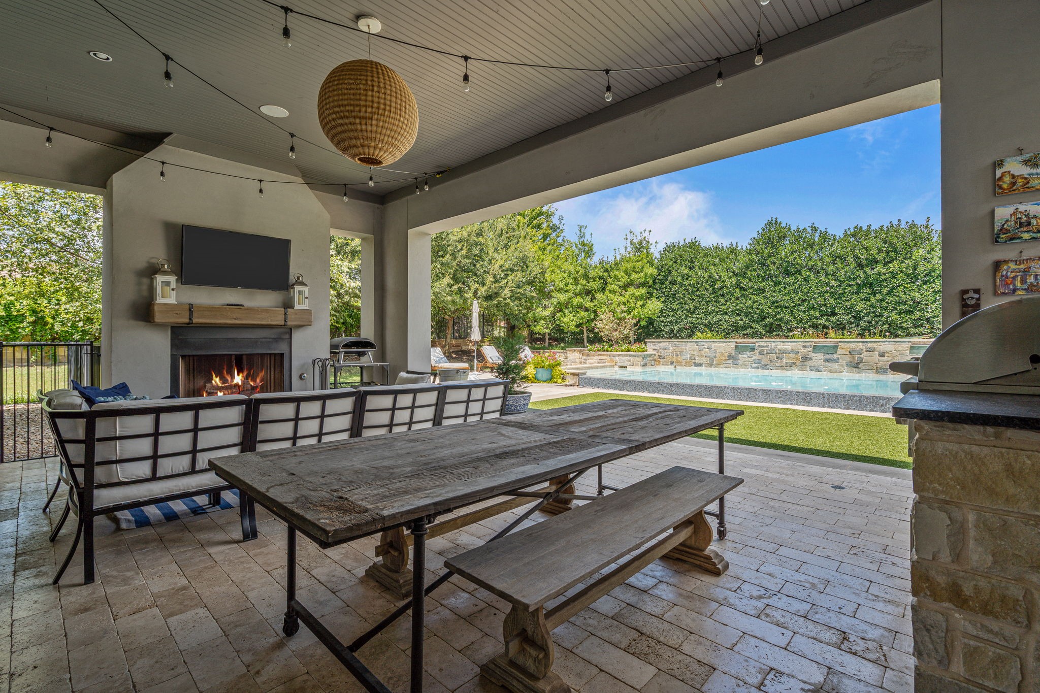 Outdoors, a sleek pool with stone water features, a covered patio with fireplace, and a full outdoor kitchen make entertaining seamless year-round. A private rear gate provides access to neighborhood walking trails, ponds, and playground.