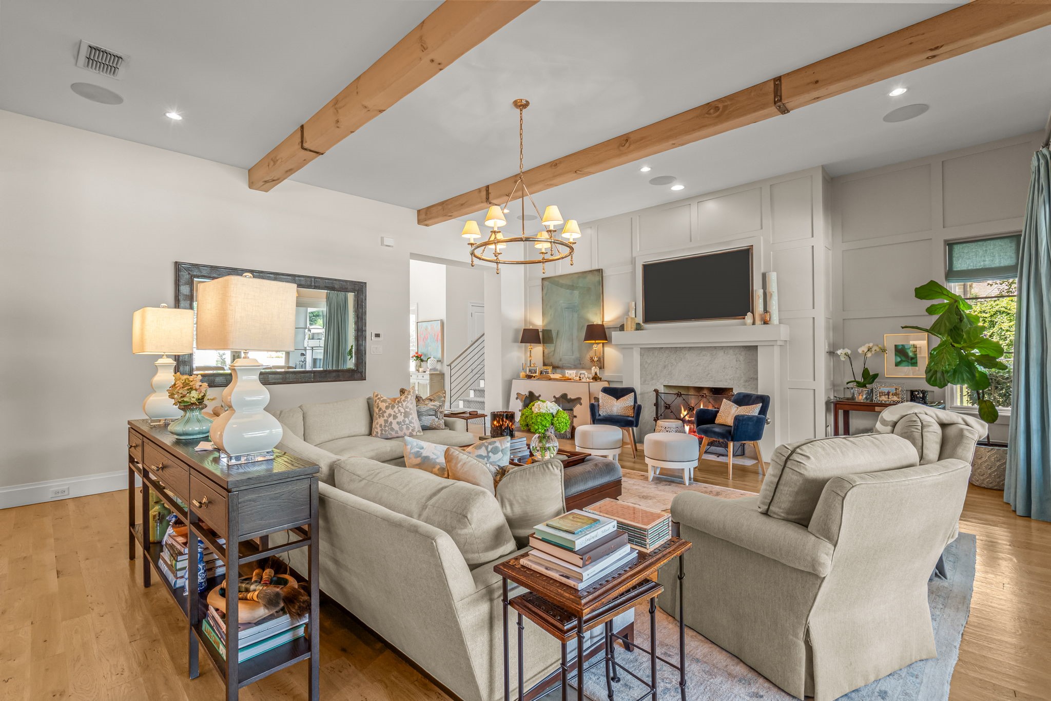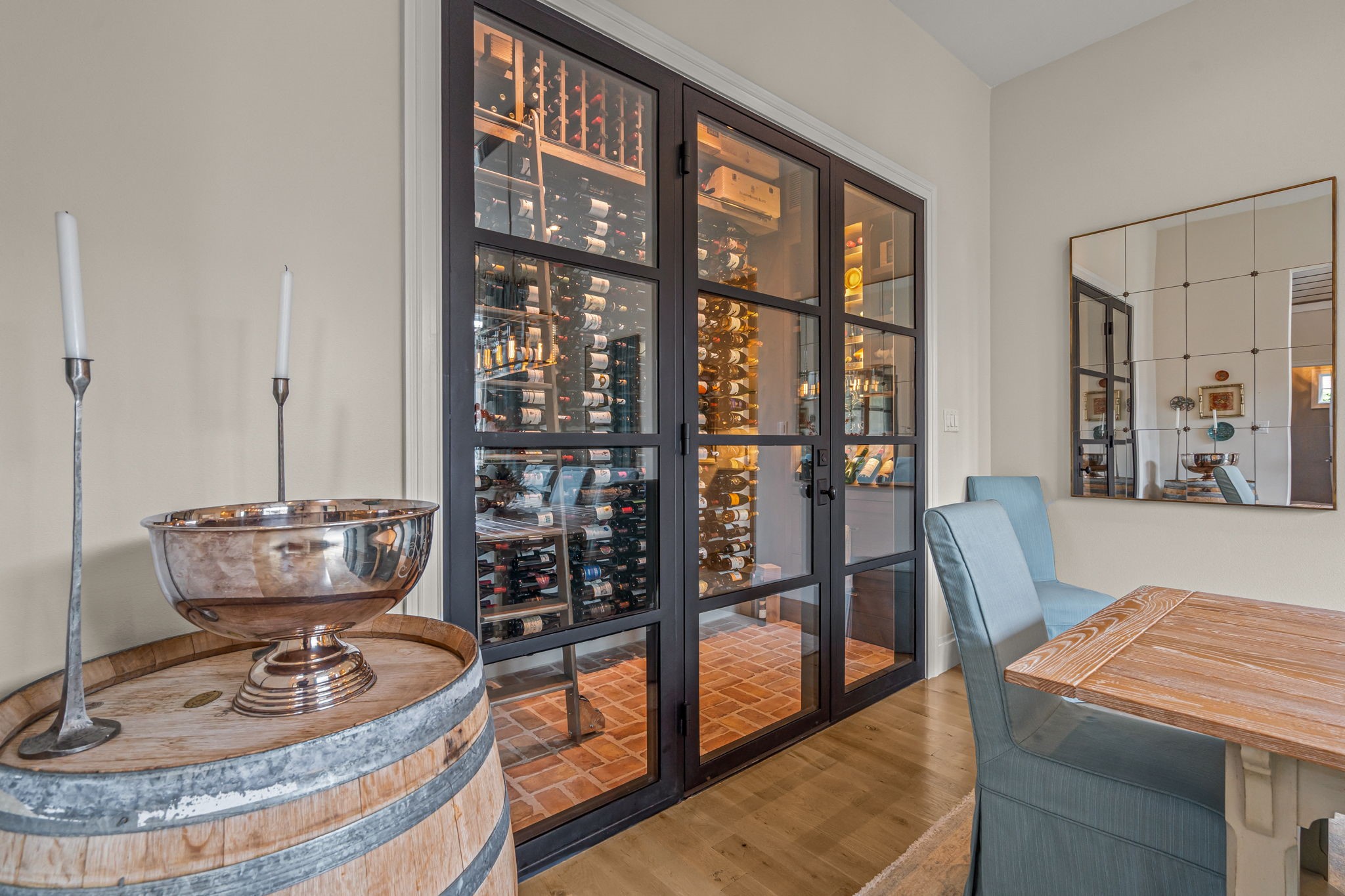 Inside, expansive windows fill the home with natural light, highlighting multiple living areas that create a comfortable yet elegant flow. The chef's kitchen is a showpiece with custom cabinetry, Wolf range, oversized island with butcher block, and a breakfast area overlooking the pool. A formal dining room is elevated by a dramatic glass-enclosed wine wall.